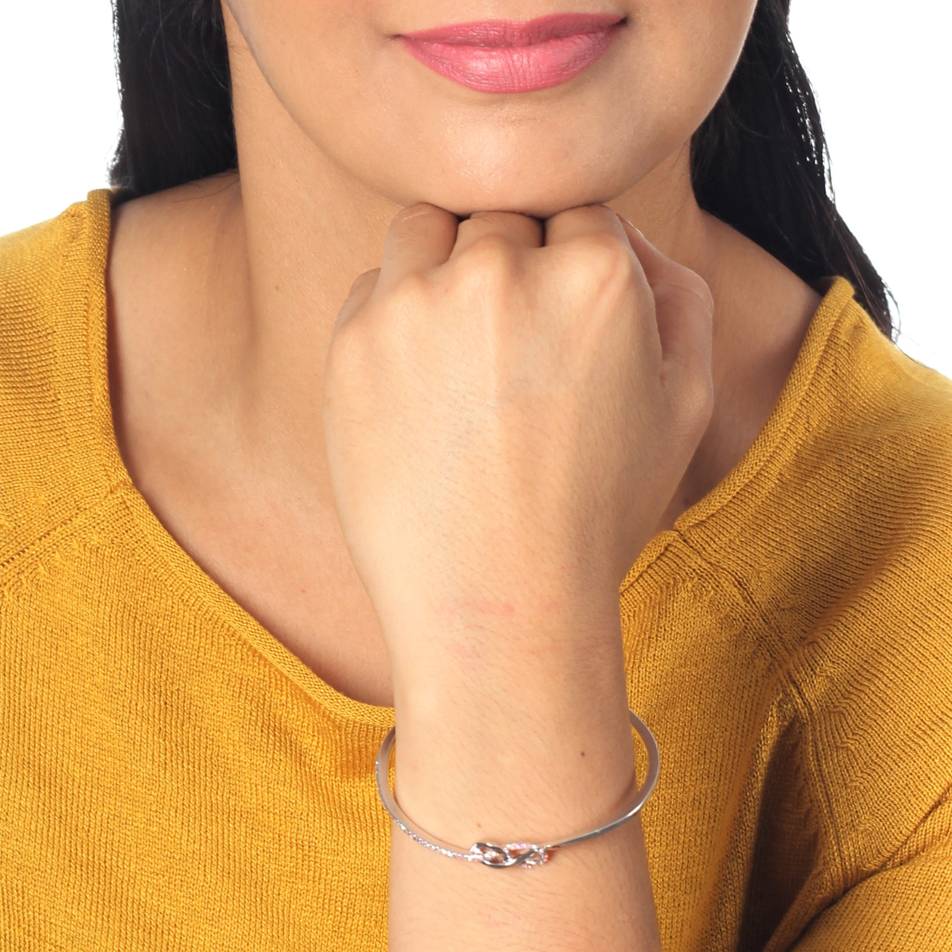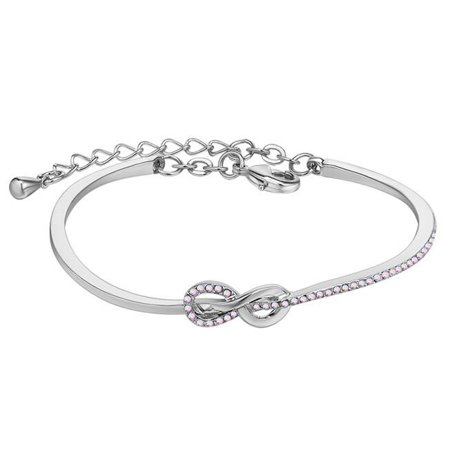 Delicado brazalete, en baño de oro blanco de 18 quilates, diseño de infinito "∞", con incrustaciones de cristales en color tornasol.