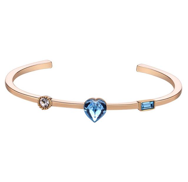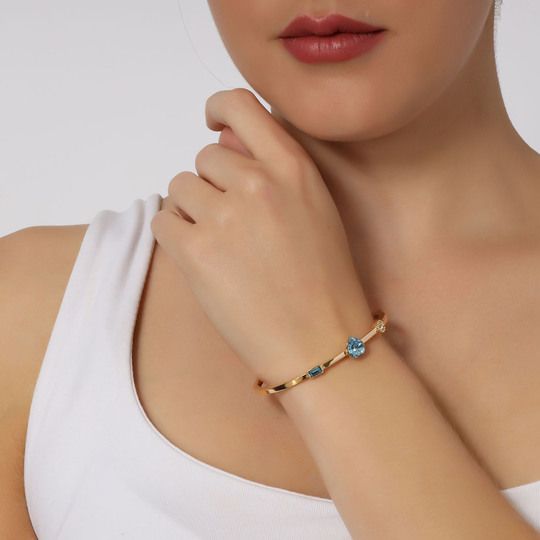 Hermoso brazalete, en baño de oro amarillo de 18 quilates, diseño de corazón en cristal azul, con cristal azul corte baguette e incrustaciones de cristales blancos. Fabricado en una estructura de aleación de platino con rodio sin níquel.