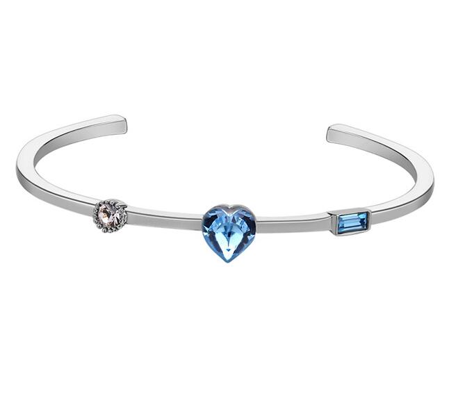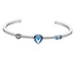 Delicado brazalete,, en baño de oro blanco de 18 quilates, lindo diseño de corazón en cristal azul, cristal azul corte baguette e incrustaciones de cristales blancos.