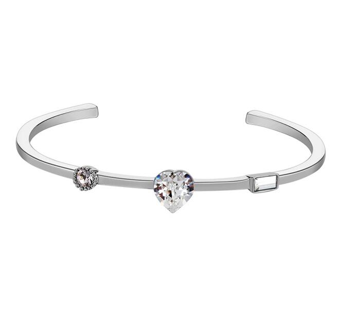 Hermoso brazalete, en baño de oro blanco de 18 quilates, lindo diseño de corazón en cristal blanco e incrustaciones de cristales blancos.