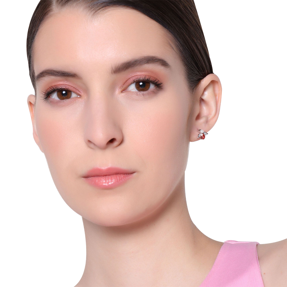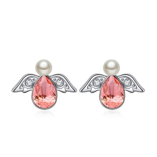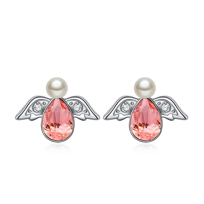 Lindos aretes en baño de oro blanco de 18 quilates, diseño de angel, con perla blanca, cristal rosa corte pera e incrustraciones de cristales blancos.