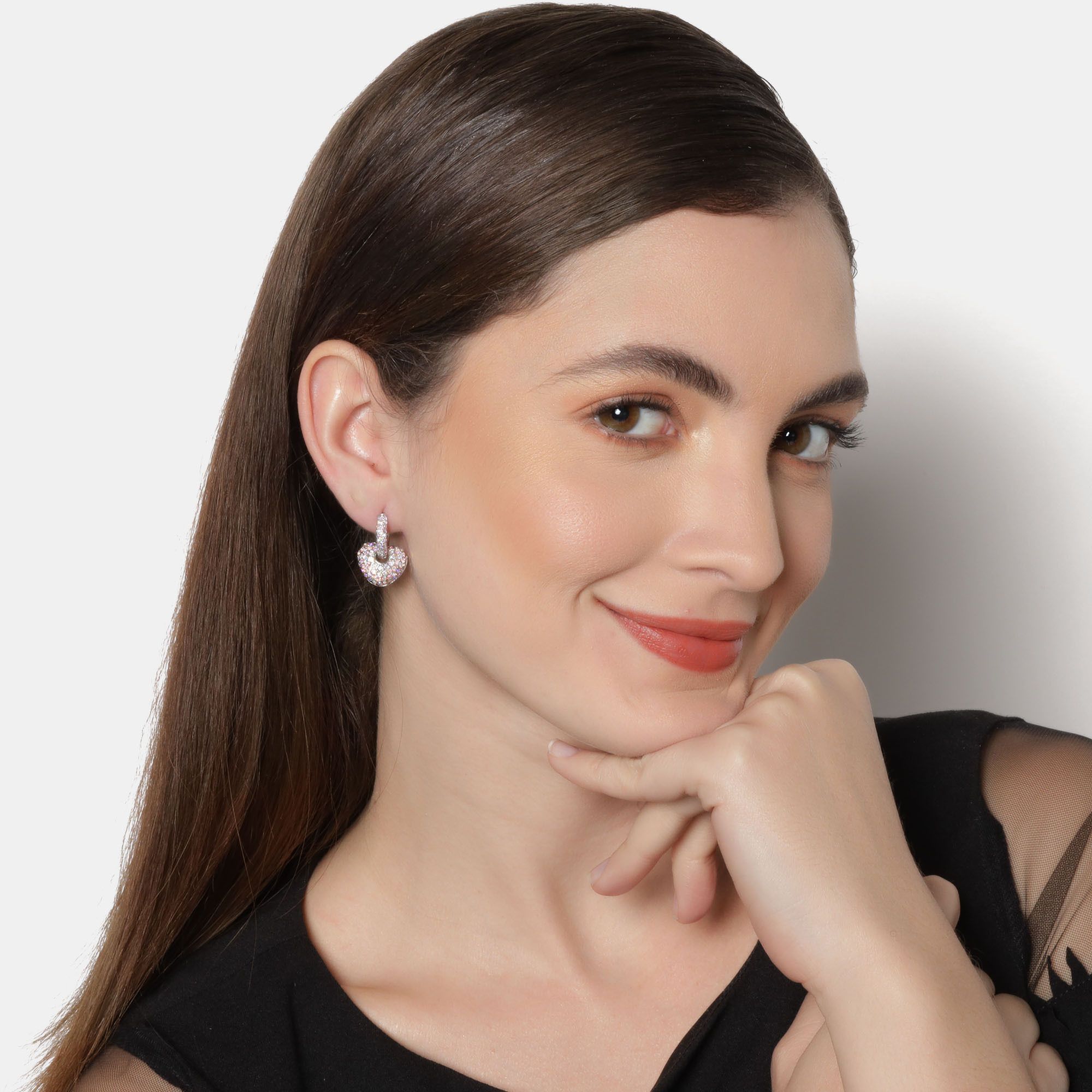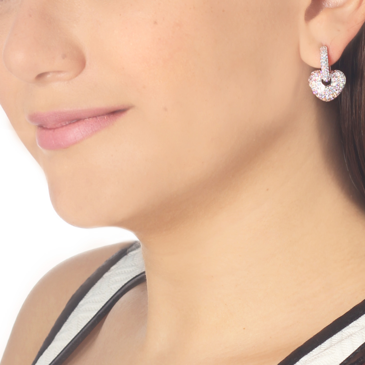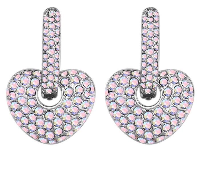 aretes, en baño de oro blanco de 18 quilates, diseño de pequeño corazón, con incrustaciones