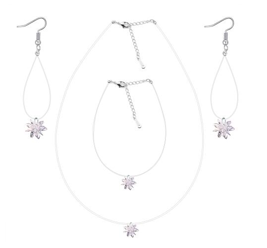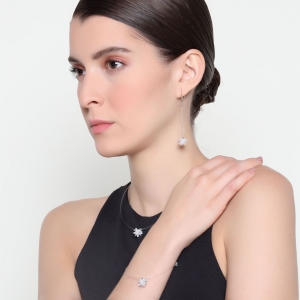 Juego de aretes, pulsera y dije en baño de oro blanco de 18 quilates, diseño de estrella con incrustación de cristales en color blanco.