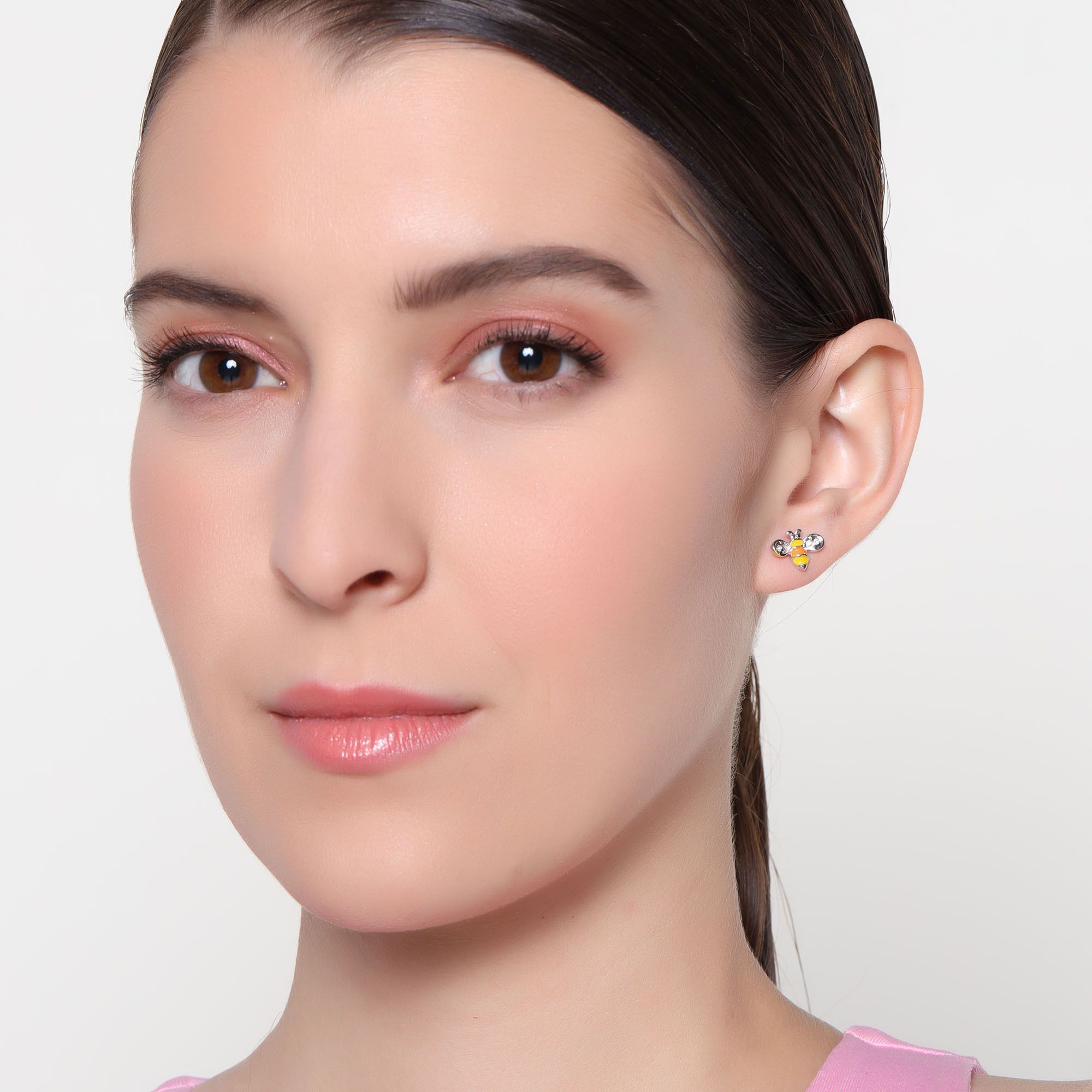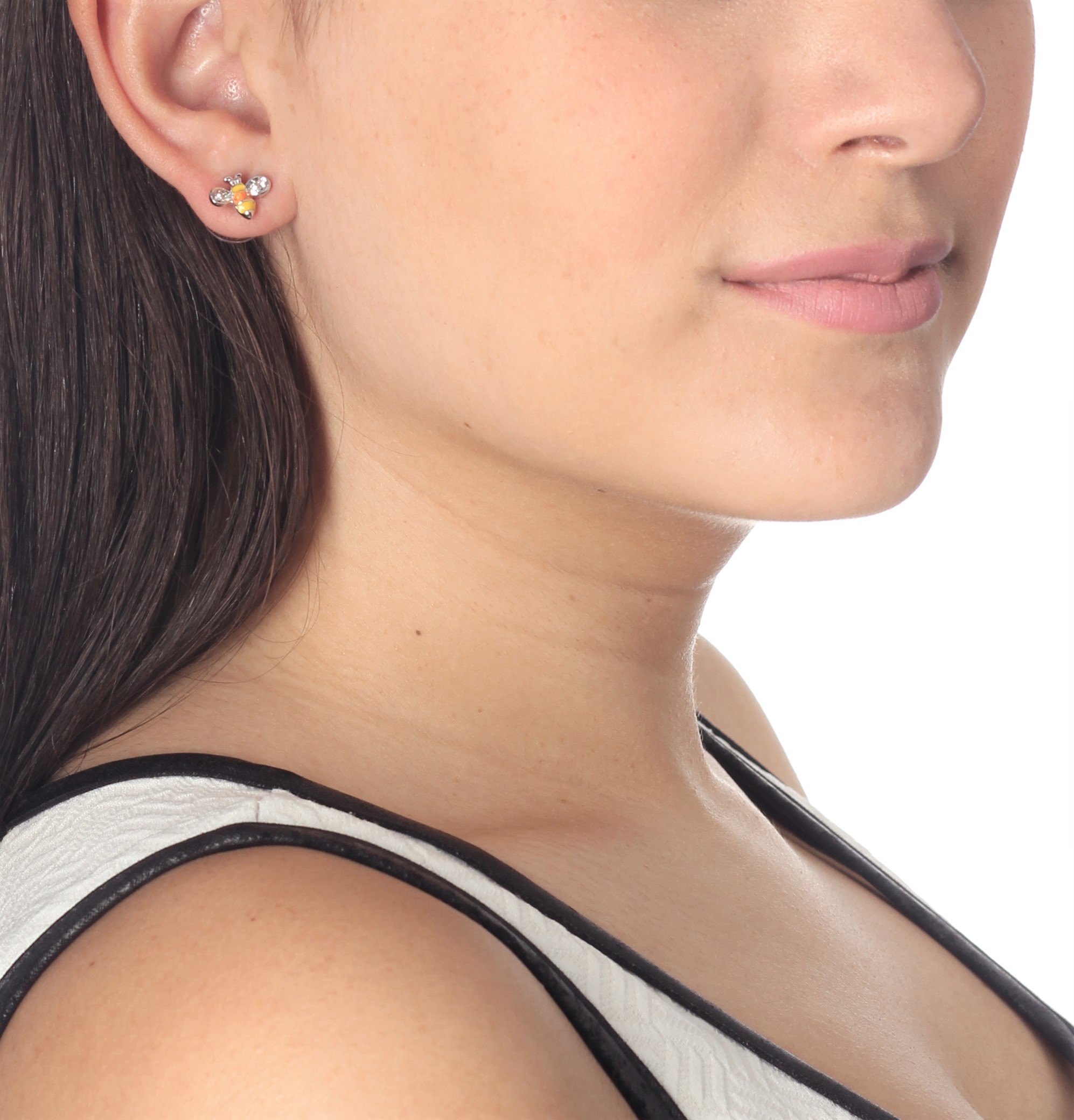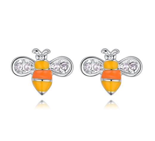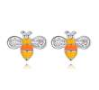 Tiernos aretes, en baño de oro blanco de 18 quilates, diseño de abejas, con incrustraciones de cristales en color blanco y esmaltado en color amarillo y naranja.