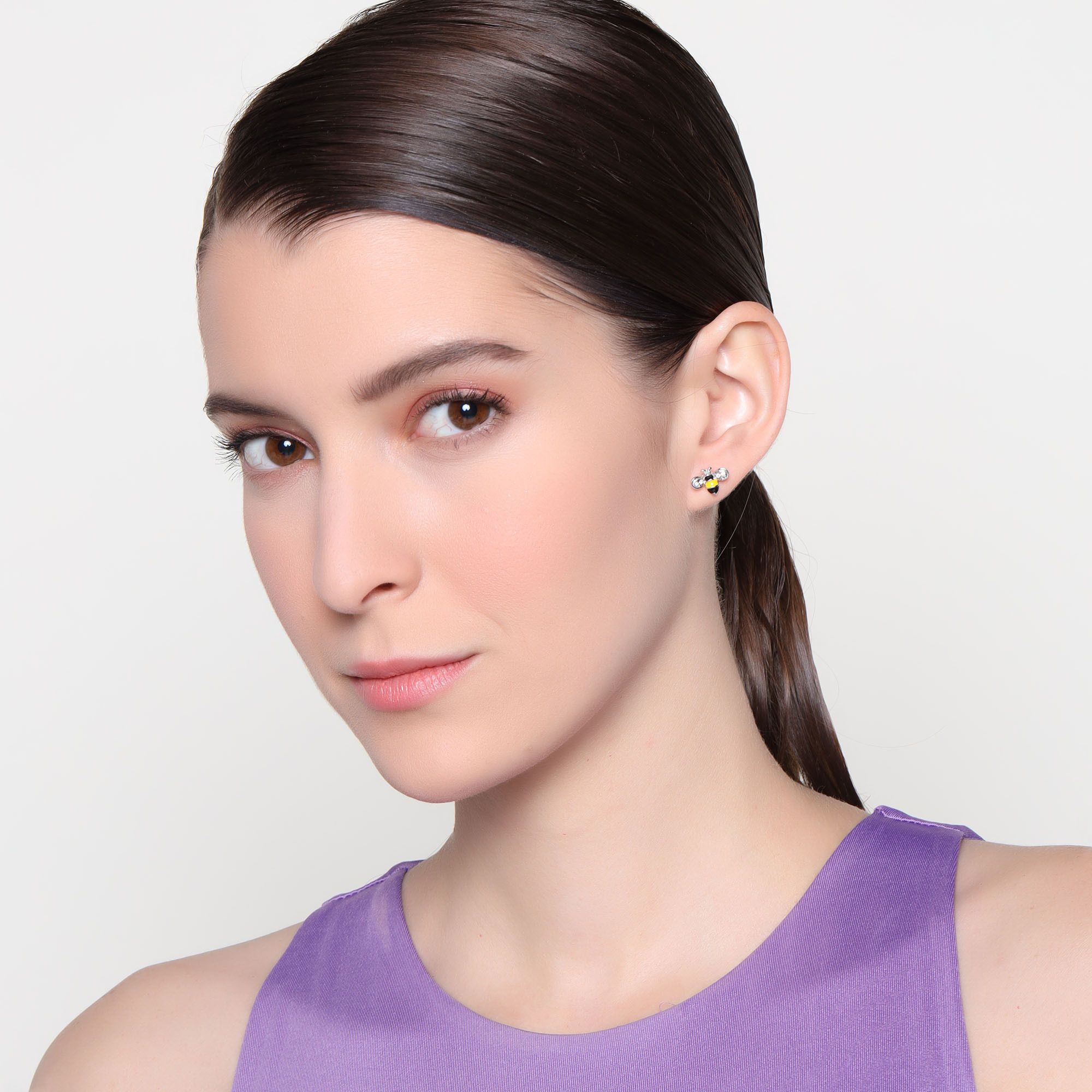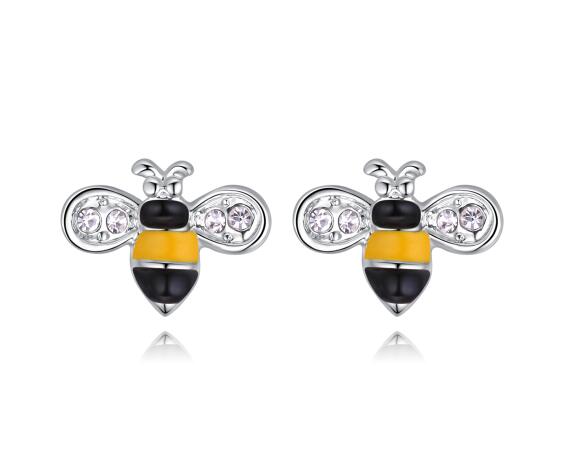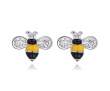 Tiernos aretes, en baño de oro blanco de 18 quilates, diseño de abejas, con incrustraciones de cristales en color blanco y esmaltado en color amarillo y negro.