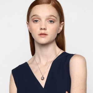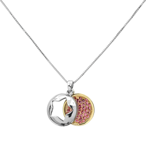 Dije con cadena en ba�o de oro blanco de 18 quilates, dise�o de c�rculo con estrella calada al centro e incrustaciones de cristales color rosa.