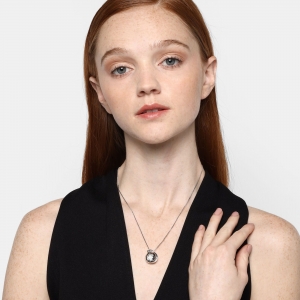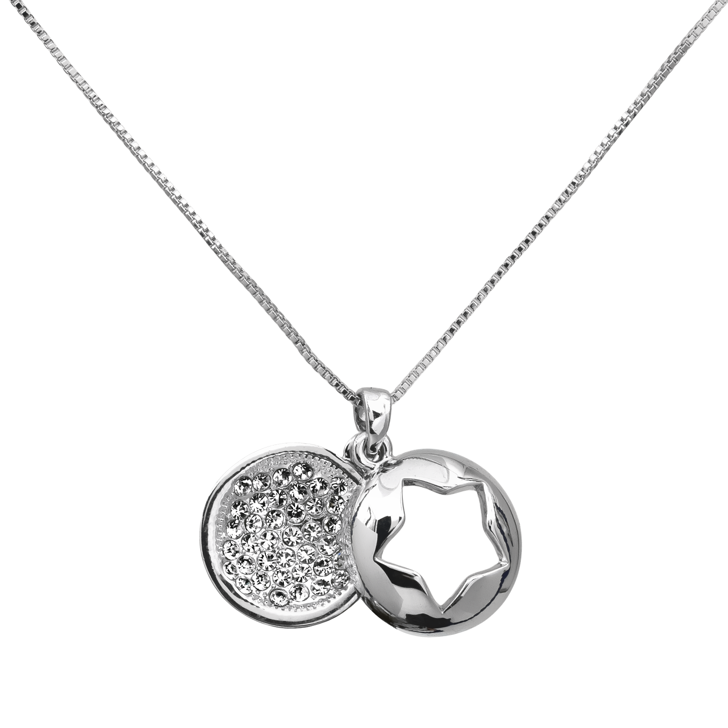 Dije con cadena en ba�o de oro blanco de 18 quilates, dise�o de c�rculo con estrella calada al centro e incrustaciones de cristales blancos.