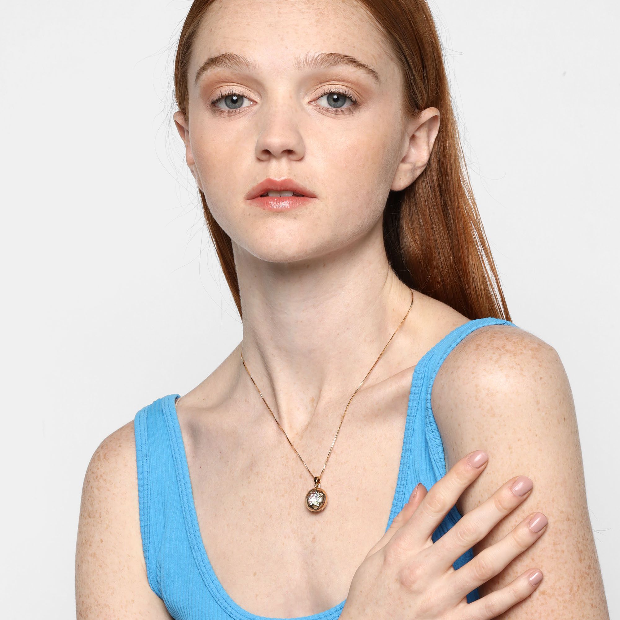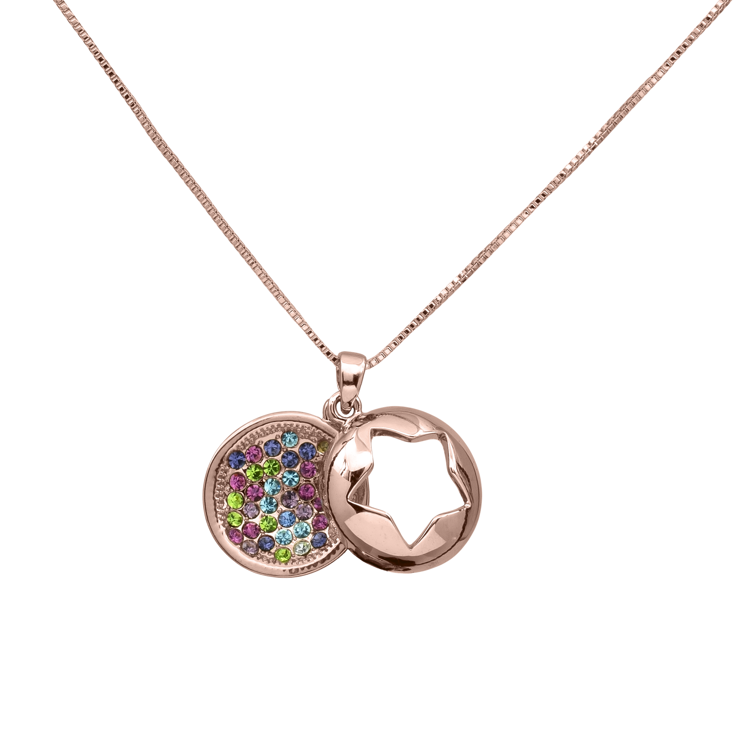 Dije con cadena en ba�o de oro rosa y blanco de 18 quilates, dise�o de c�rculo con estrella calada al centro e incrustaciones de cristales multicolor.