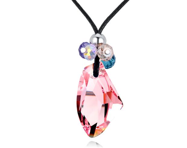 Original collar con detalles en baño de oro blanco de 18 quilates, cuerda color negro, cristal rosa asimétrico y cuentas de cristales en colores rosa, lila, azul y blanco.