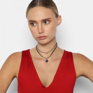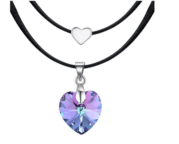 Original collar, con detalles en baño de oro blanco de 18 quilates, original diseño, con corazón de cristal morado, corazón plateado y correa color negro.