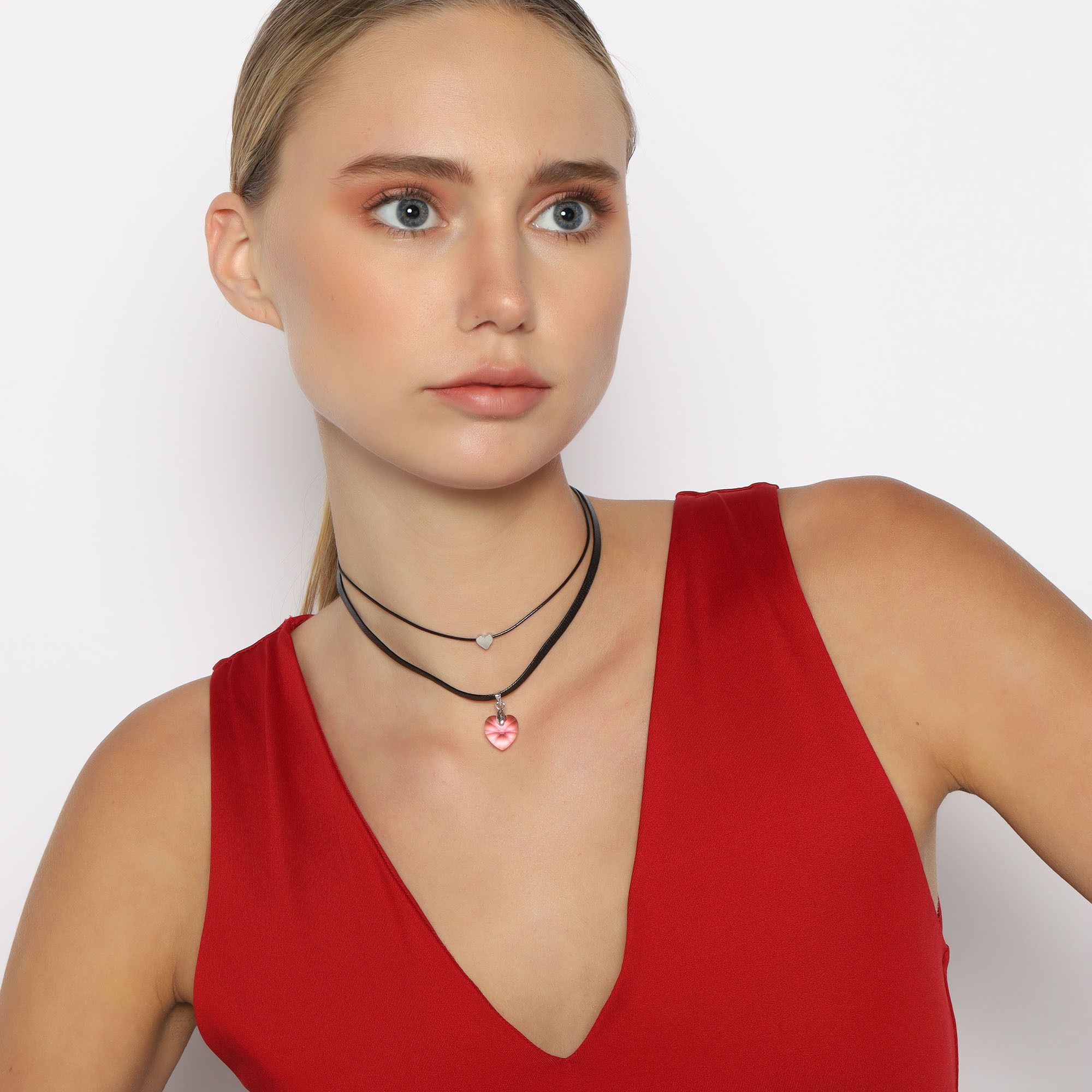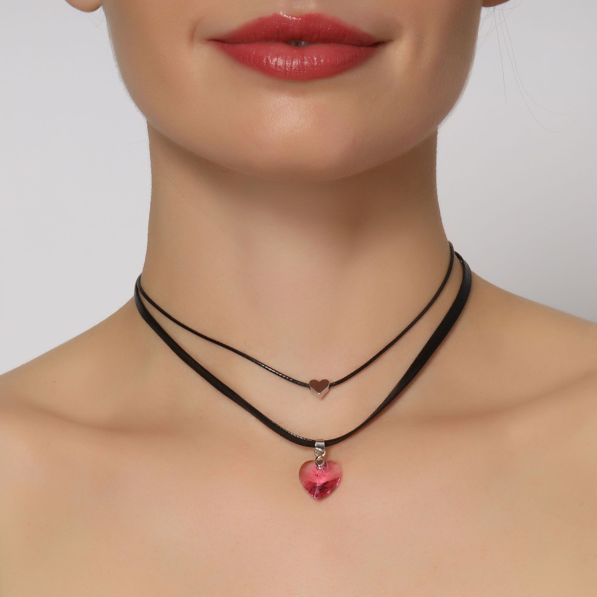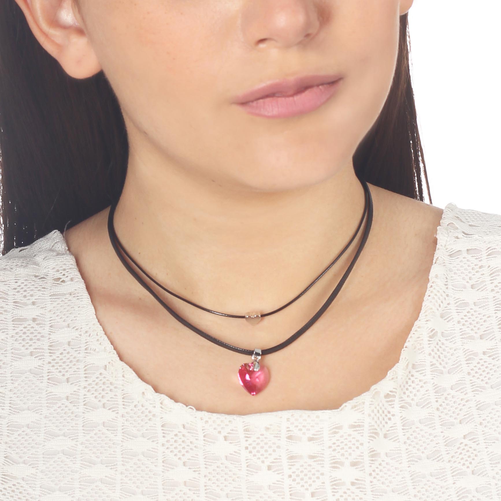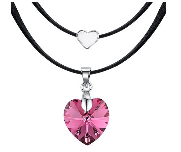 Original collar, con detalles en baño de oro blanco de 18 quilates, lindo diseño, con corazón de cristal rosa, corazón plateado y correa color negro.