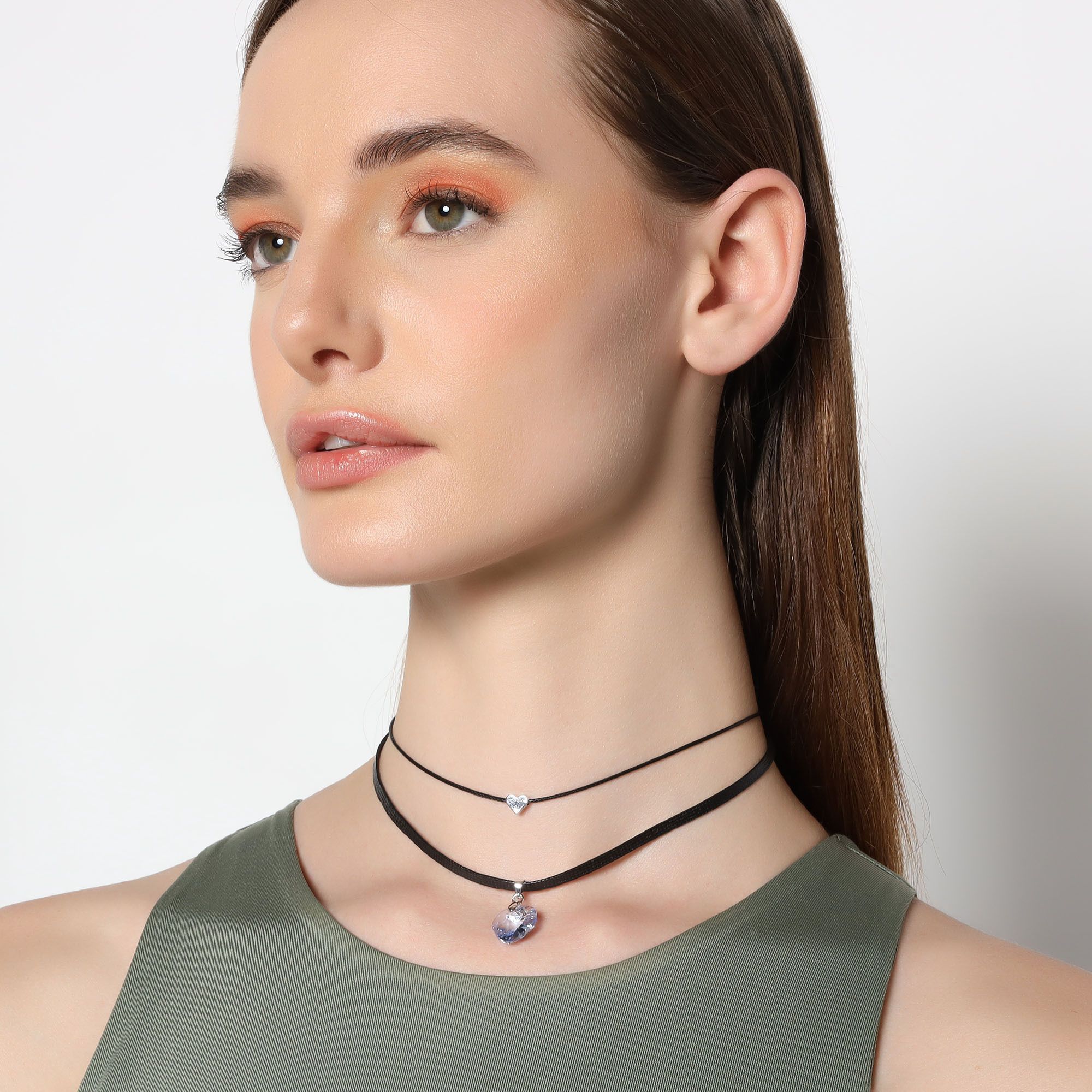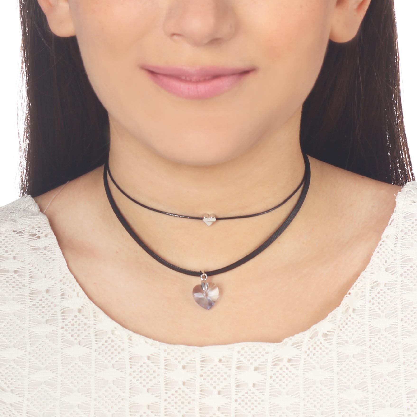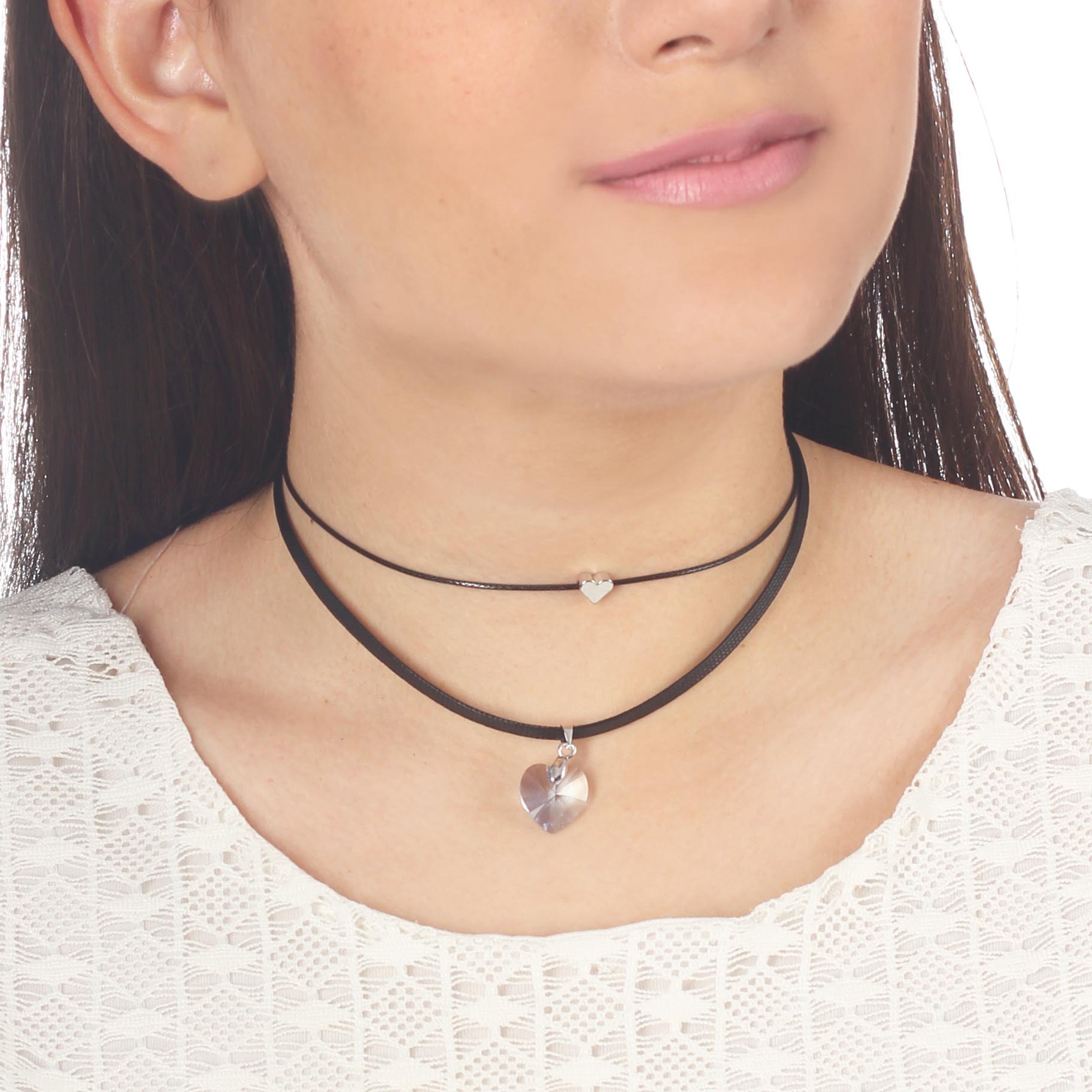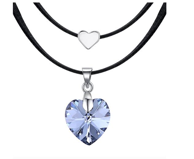 Original collar, con detalles en baño de oro blanco de 18 quilates, original diseño, con corazón de cristal morado, corazón en baño de oro blanco y correa color negro.