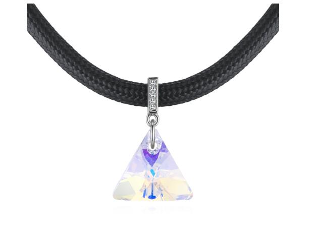 Original collar con detalles en baño de oro blanco de 18 quilates, dije de triángulo en cristal tornasol, incrustraciones de cristales blancos y correa color negro.