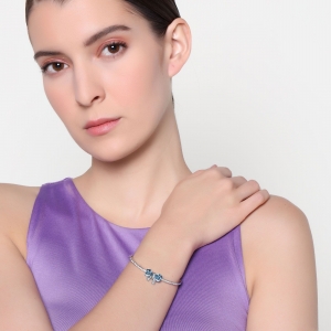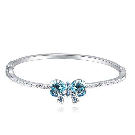 Hermoso brazalete, en baño de oro blanco de 18 quilates, lindo diseño de moño, con corazones de cristal azul e incrustaciones de cristales colores blanco e índigo.