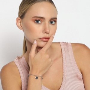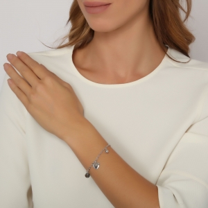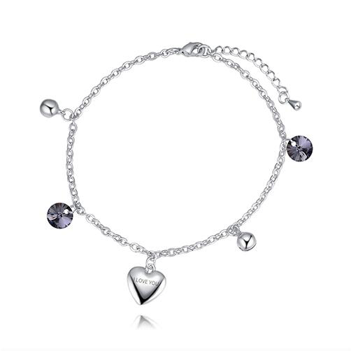 Brazalete en baño de oro blanco de 18 quilates, lindo diseño, con pequeño dije en forma de corazón y leyenda "I LOVE YOU", cristales humo y cuentas plateadas.