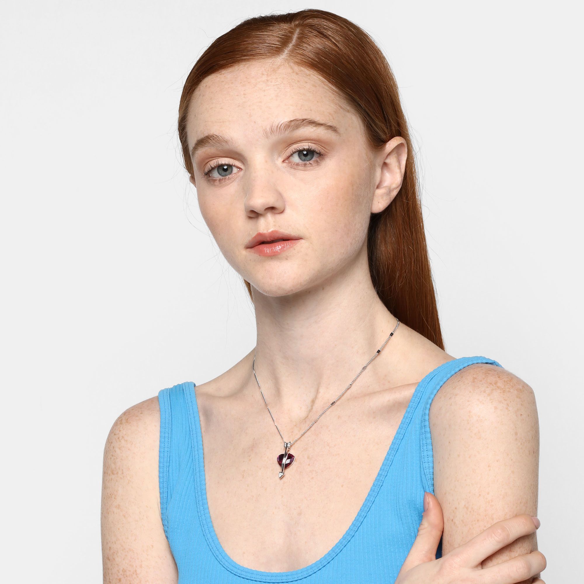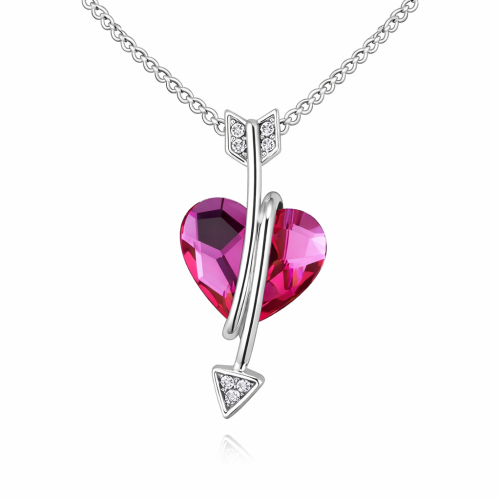 Dije con cadena en baño de oro blanco de 18 quilates, diseño de corazón en cristal fucsia, con flecha e incrustaciones de cristales blancos.