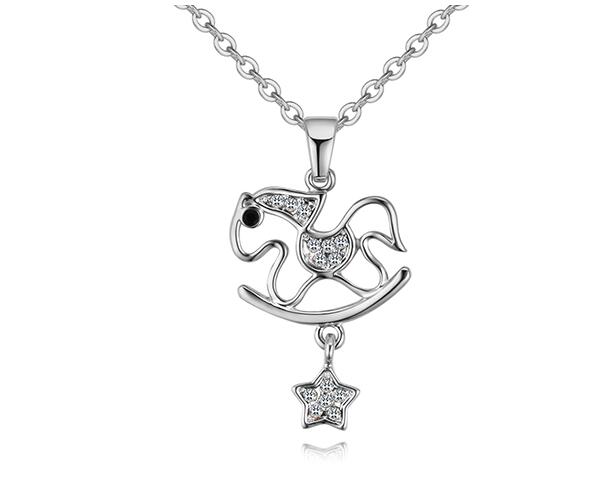 Dije con cadena en baño de oro blanco de 18 quilates, diseño de pony mecedora, con estrella e incrustaciones de cristales blancos.