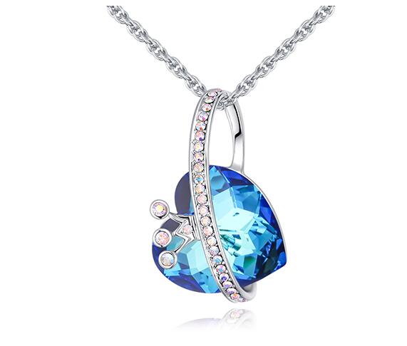 Dije con cadena en baño de oro blanco de 18 quilates, diseño de corazón en cristal azul, con pequeña corona e incrustaciones de cristales tornasol.