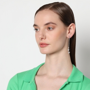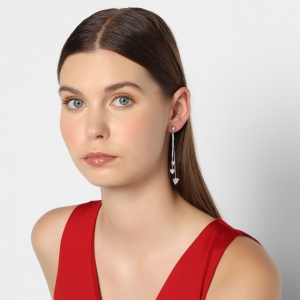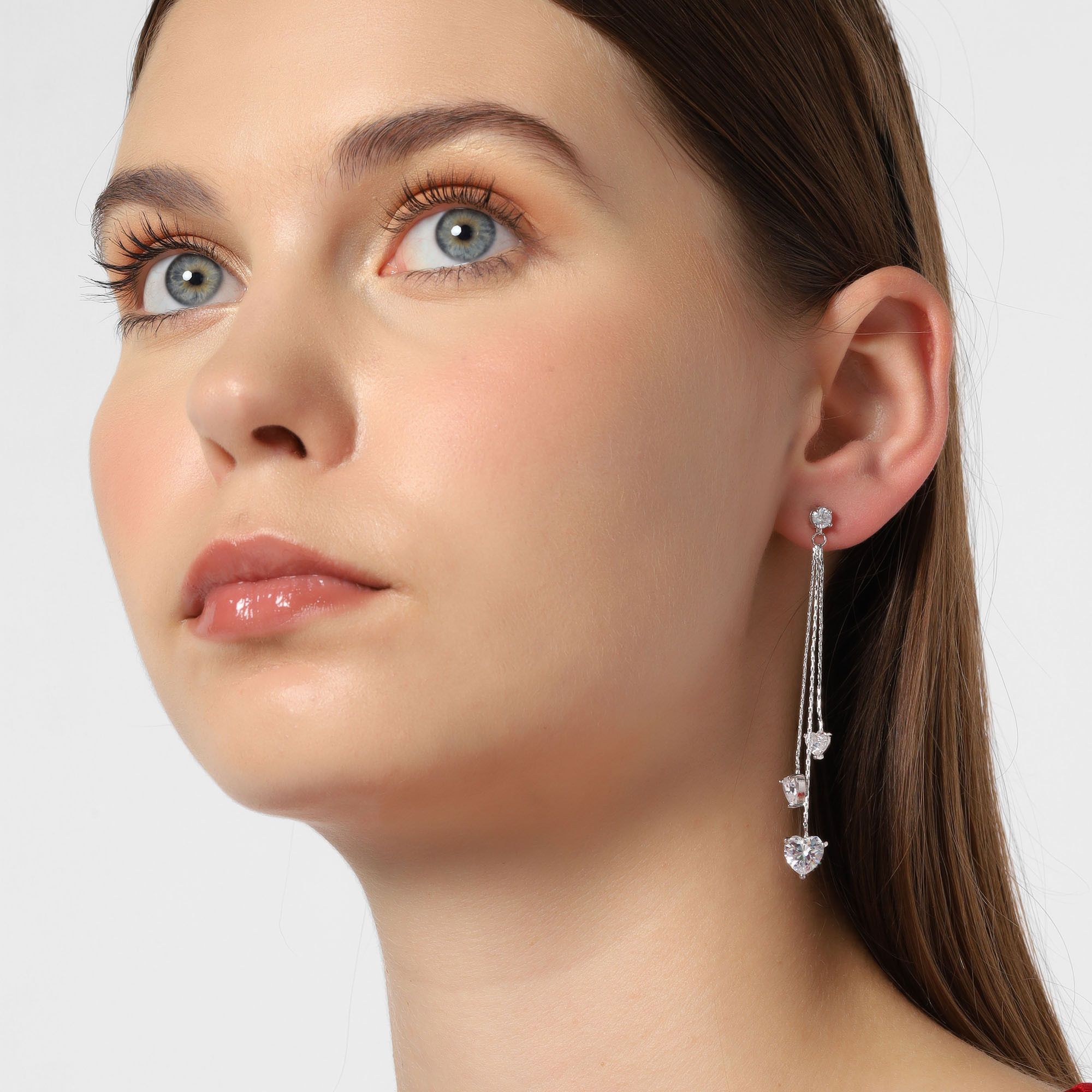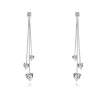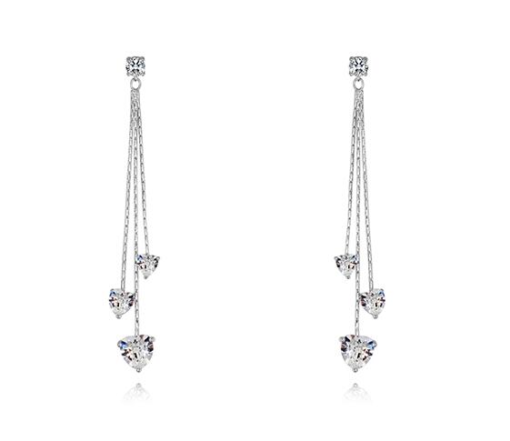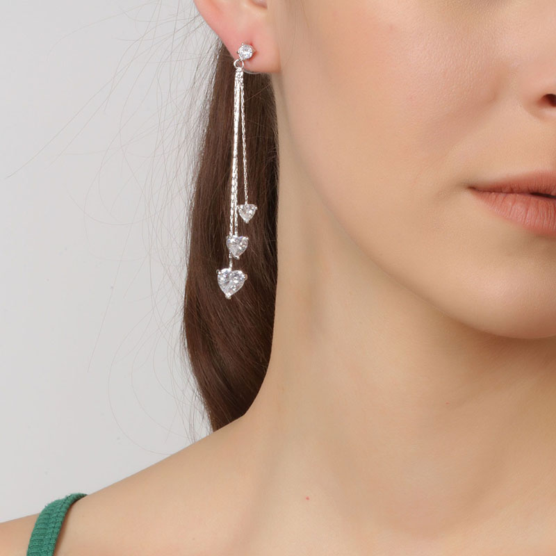 Aretes en baño de oro blanco de 18 quilates, original diseño, con tres corazones de cristal blanco, pendiendo de finas cadenas en desnivel.