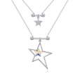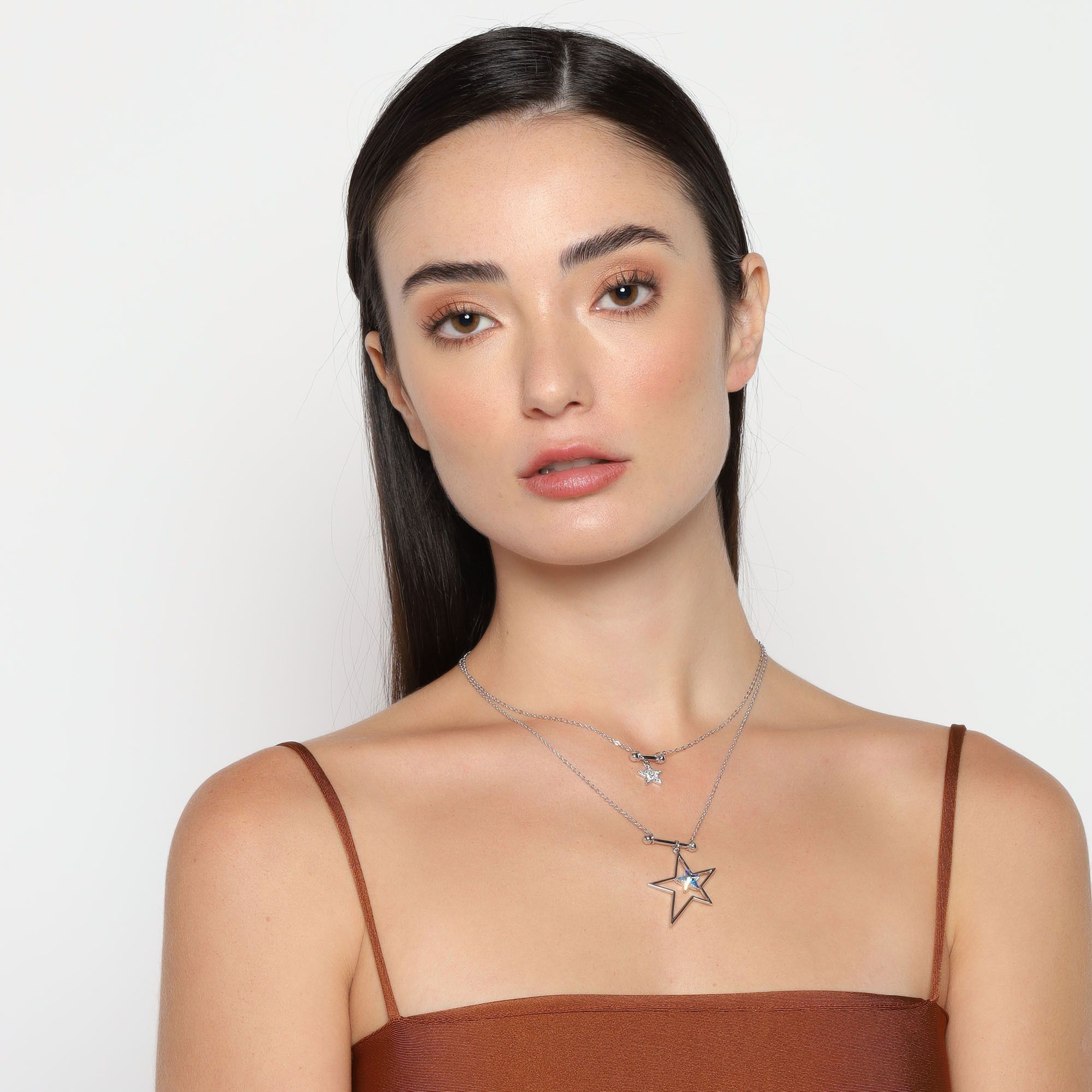 Collar en baño de oro blanco de 18 quilates, diseño de doble cadena, con dijes de estrella e incrustaciones de cristales en forma de estrella colores tornasol y blanco.