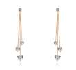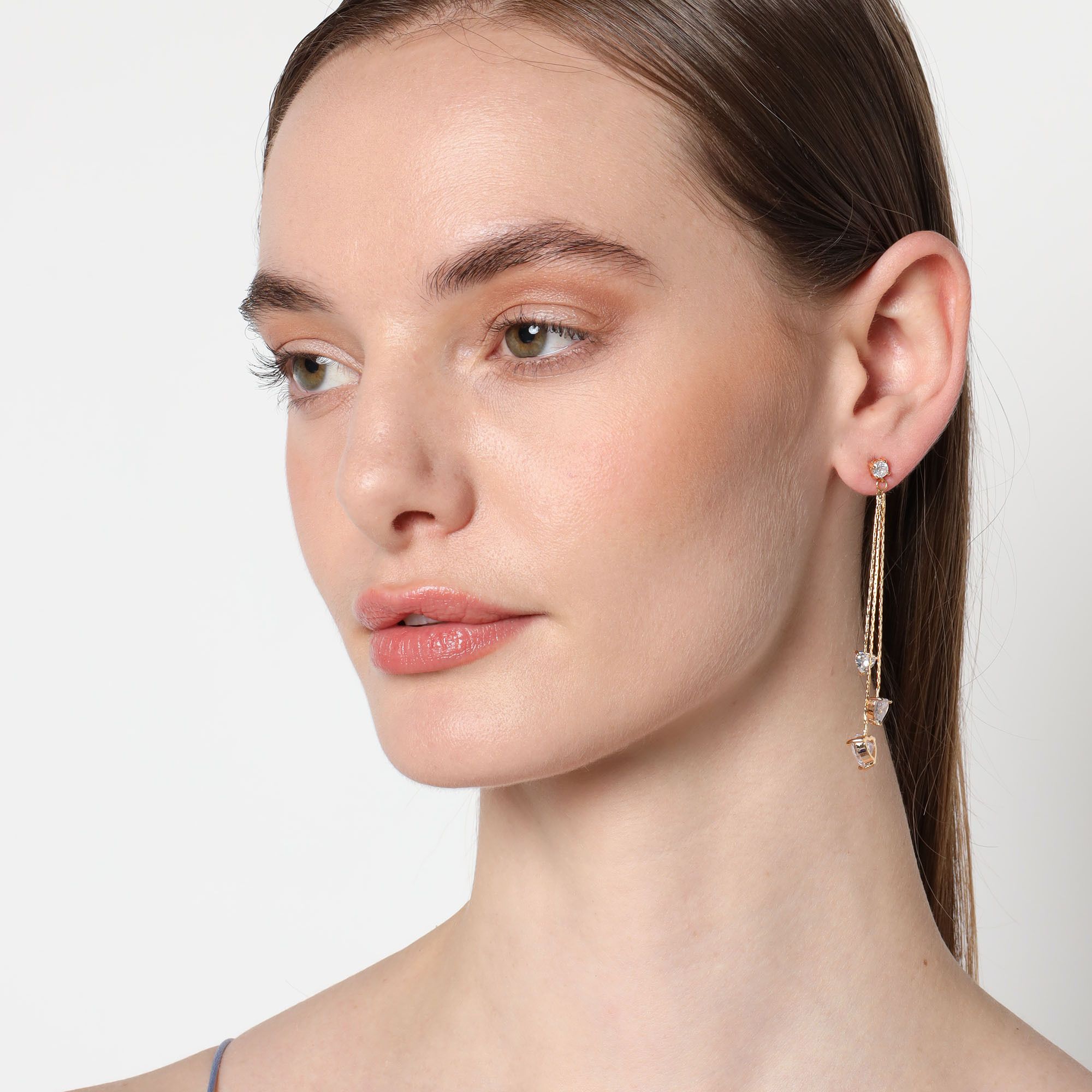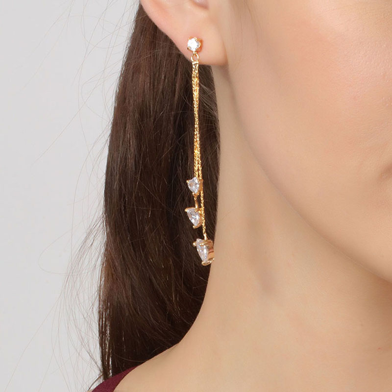 Aretes en baño de oro amarillo de 18 quilates, original diseño de tres corazones colgantes con incrustración de cristales en color blanco.