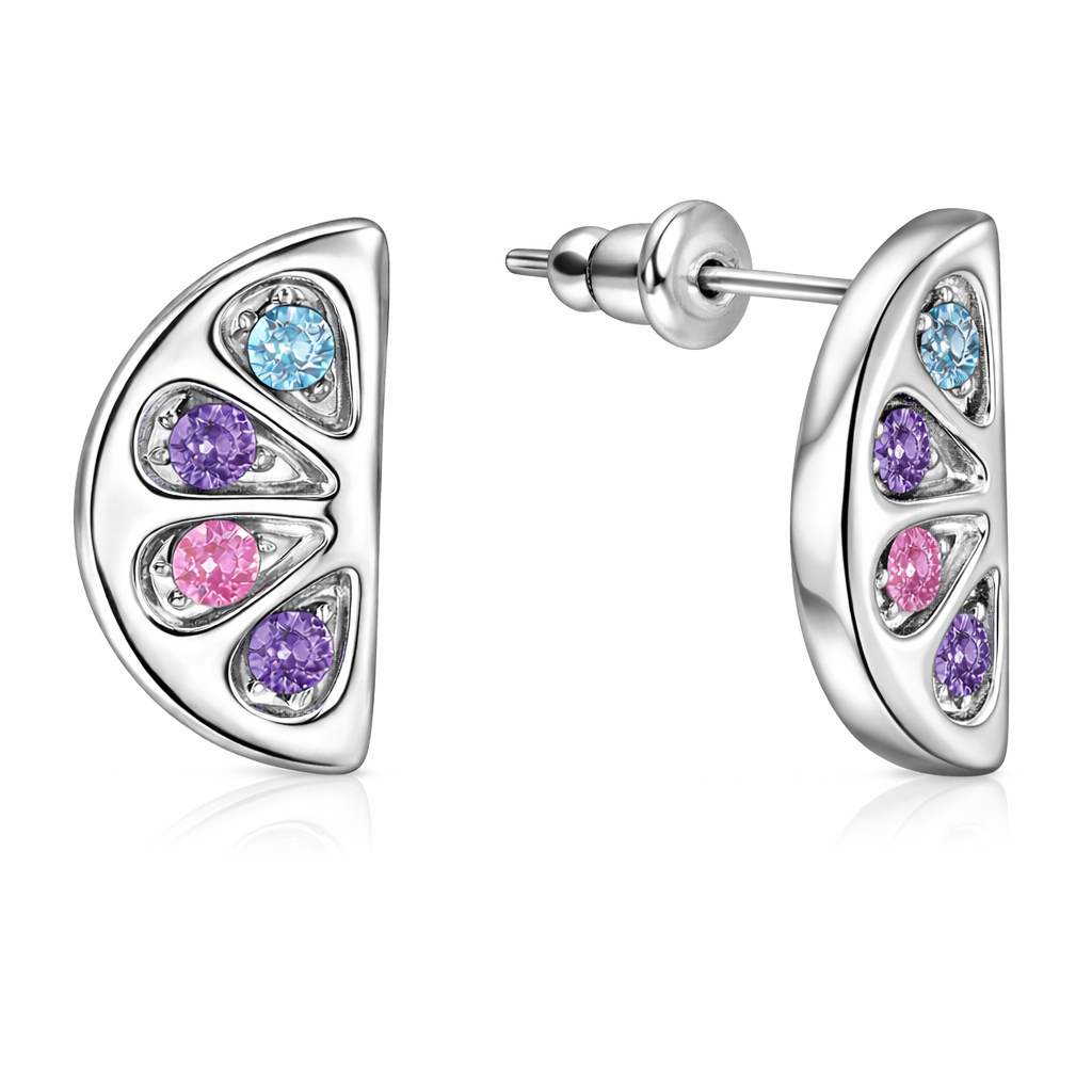 Aretes en baño de oro blanco de 18 quilates, original diseño, de media naranja con incrustración de cristales en colores.