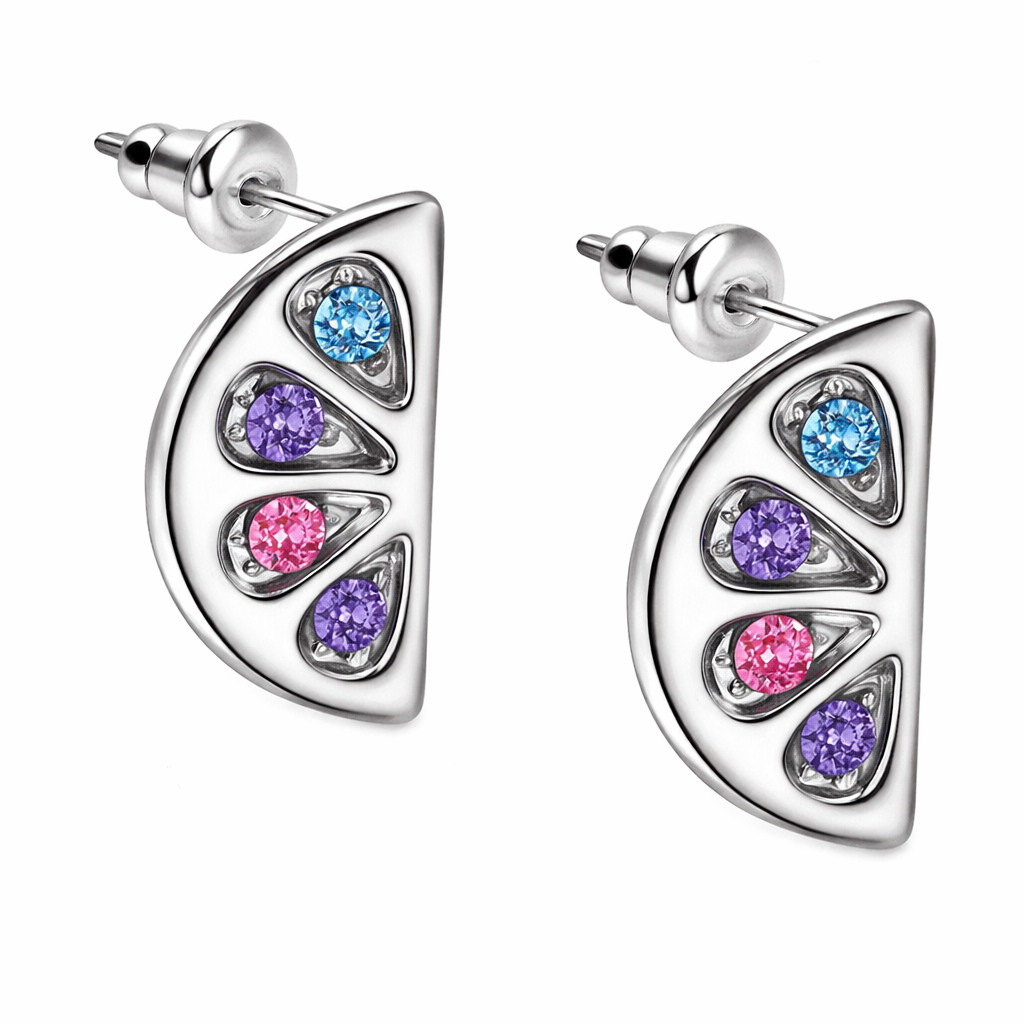 Aretes en baño de oro blanco de 18 quilates, original diseño, de media naranja con incrustración de cristales en colores.