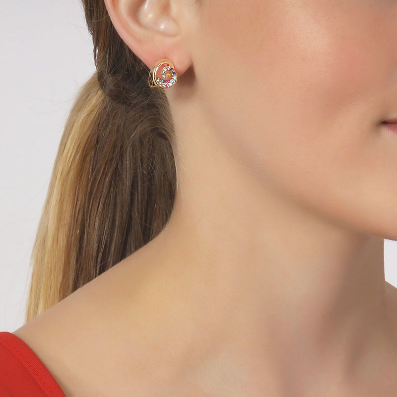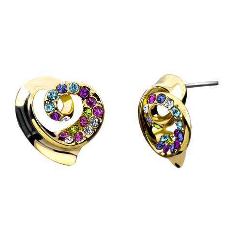 Aretes en baño de oro amarillo de 18 quilates, lindo diseño de corazón, con incrustraciones de cristales en colores. Fabricado en una estructura de aleación de platino con rodio sin níquel.