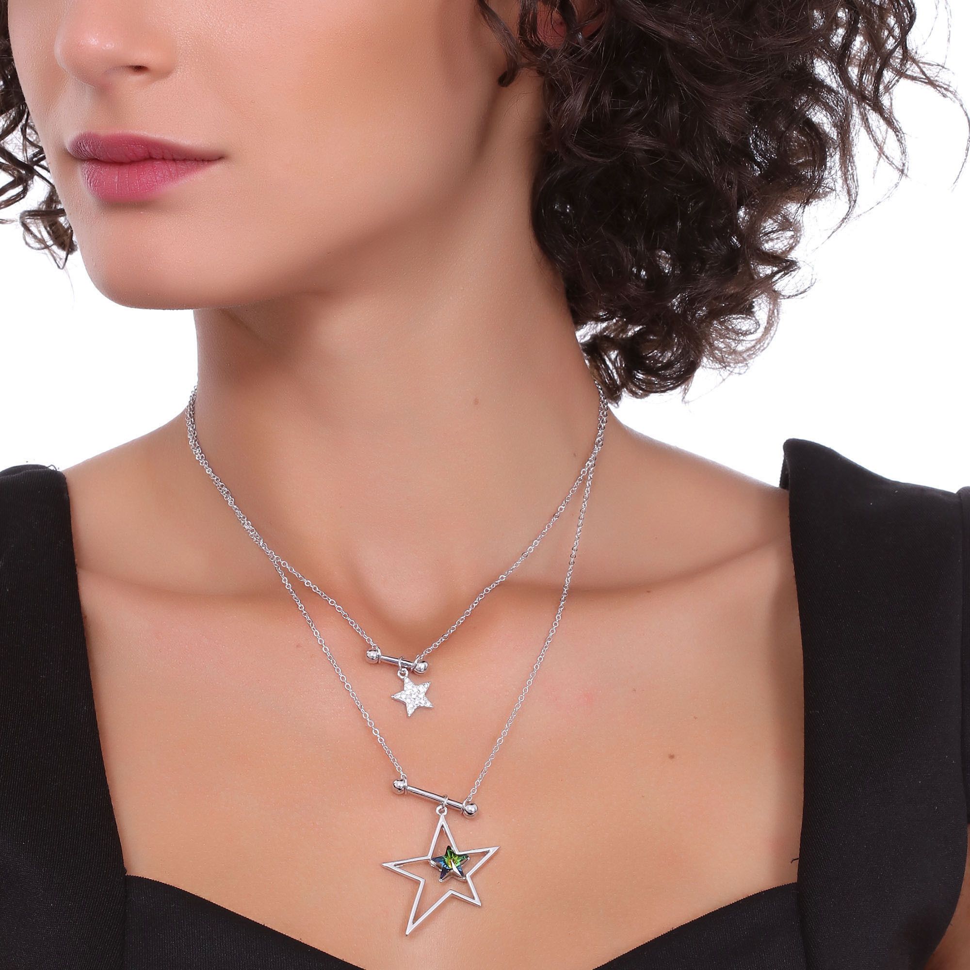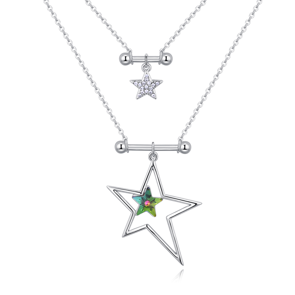 Collar en baño de oro blanco de 18 quilates, diseño de doble cadena, con dijes de estrella e incrustaciones de cristales en forma de estrella colores tornasol obscuro y blanco.