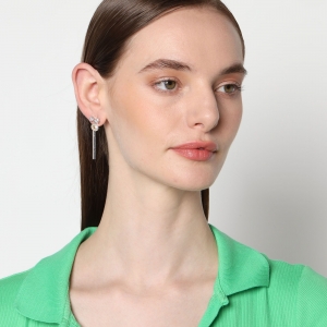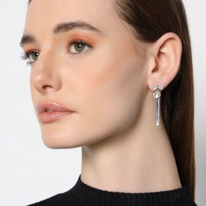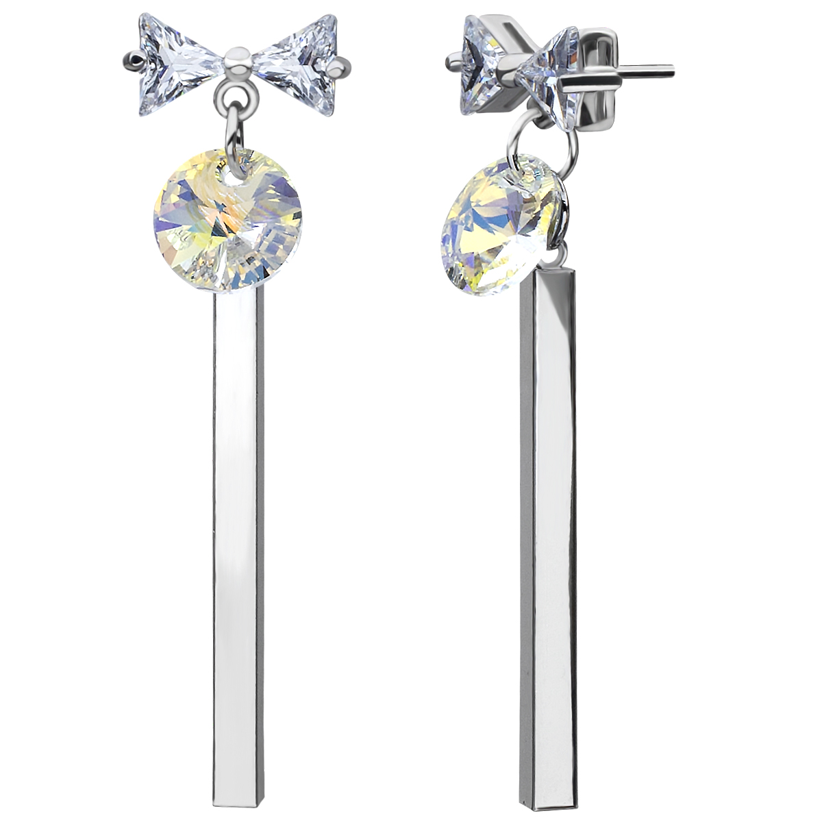 Aretes en baño de oro blanco de 18 quilates, simpático diseño de moño, con incrustraciones de cristales en color blanco y tornasol.