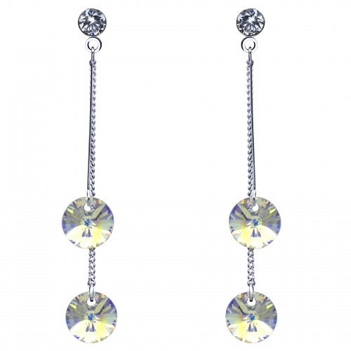 Aretes en baño de oro blanco de 18 quilates, diseño de péndulo, con cristales en color tornasol e incrustación de cristal blanco.