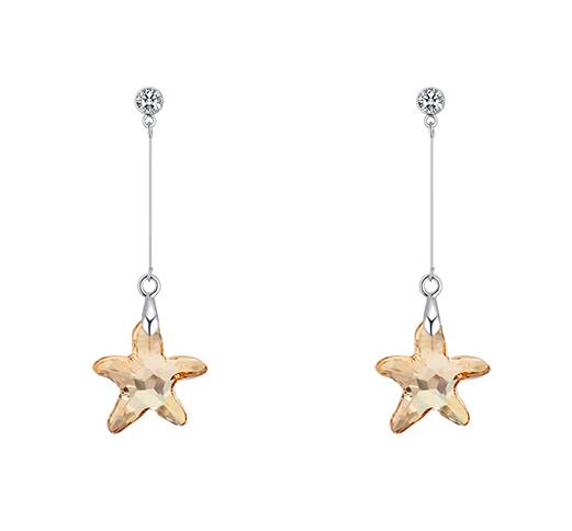 Aretes en baño de oro blanco de 18 quilates, diseño de estrella en cristal ámbar, con incrustración de cristal en color blanco.