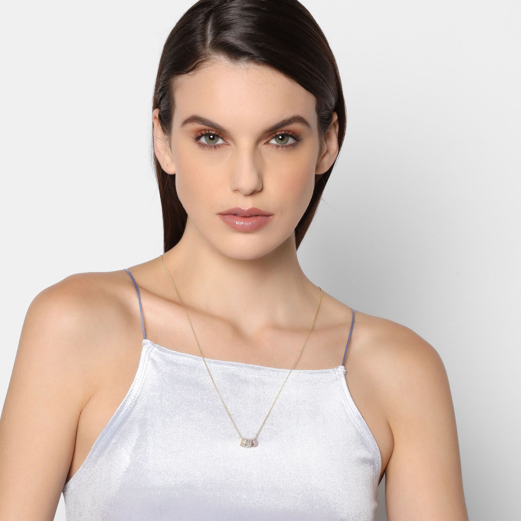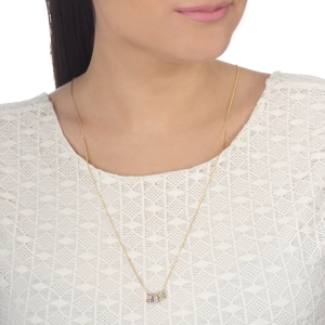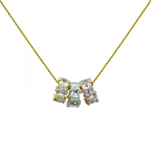 Dije con cadena en baño de oro amarillo, blanco y rosa de 18 quilates, diseño de cilindros con incrustaciones de cristales en color blanco.