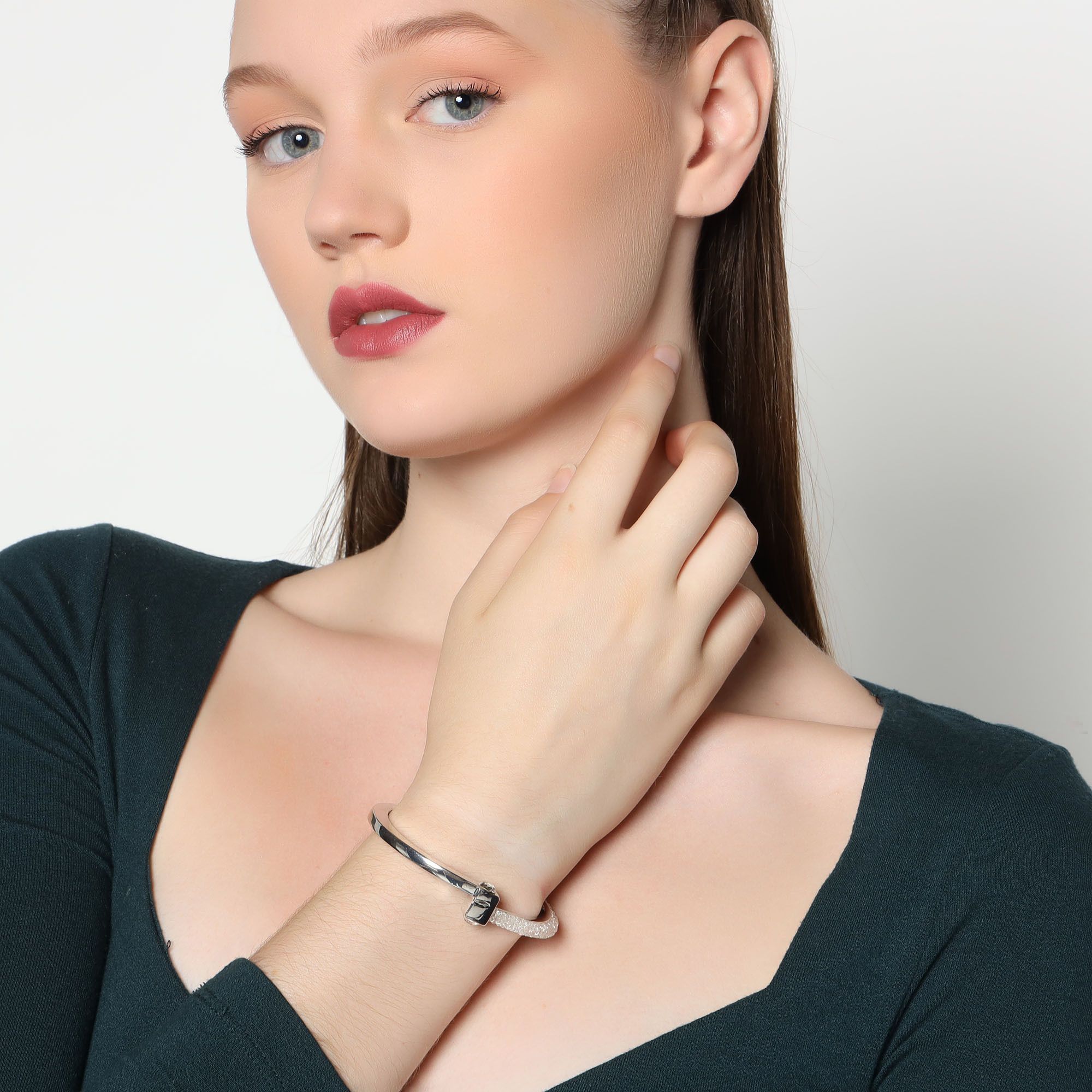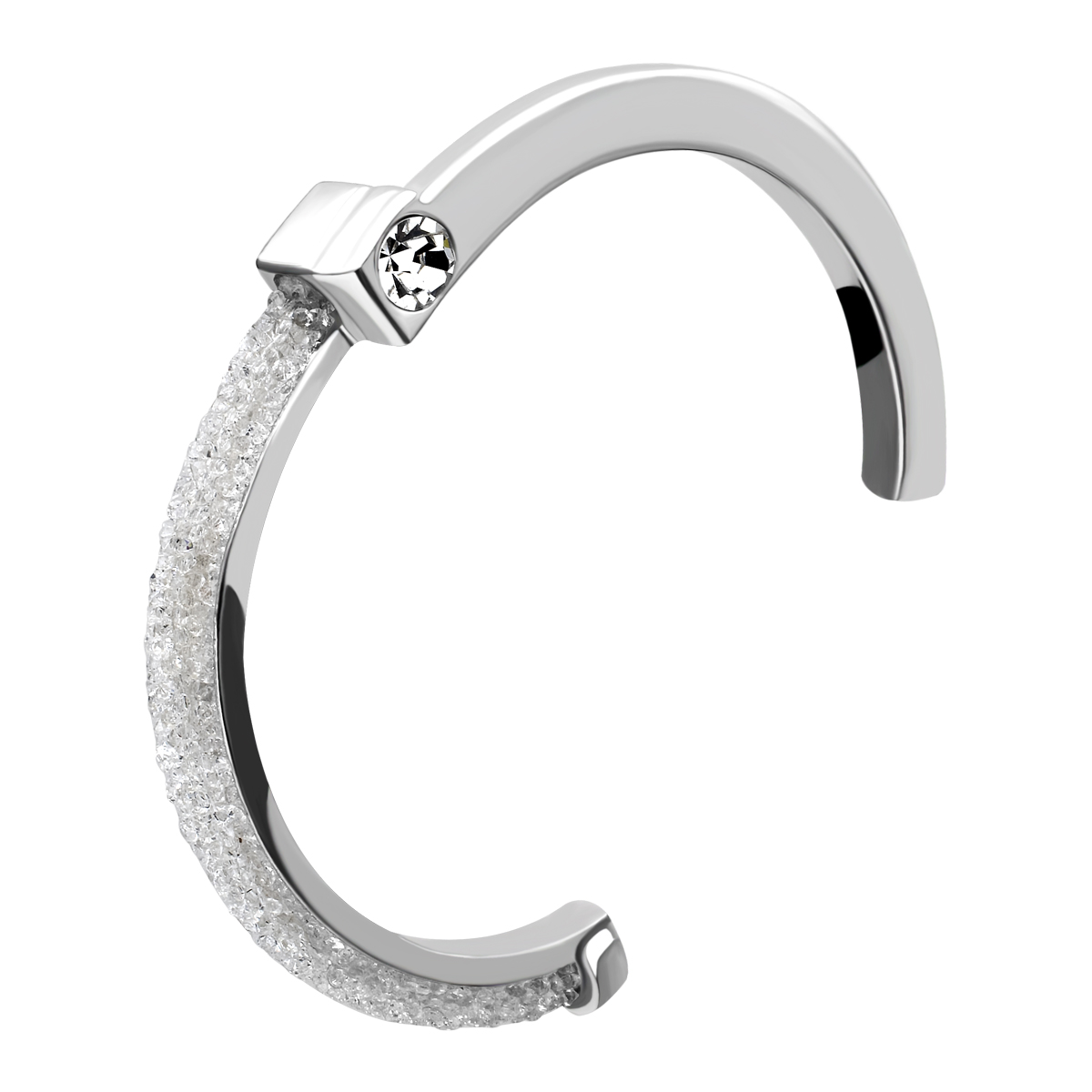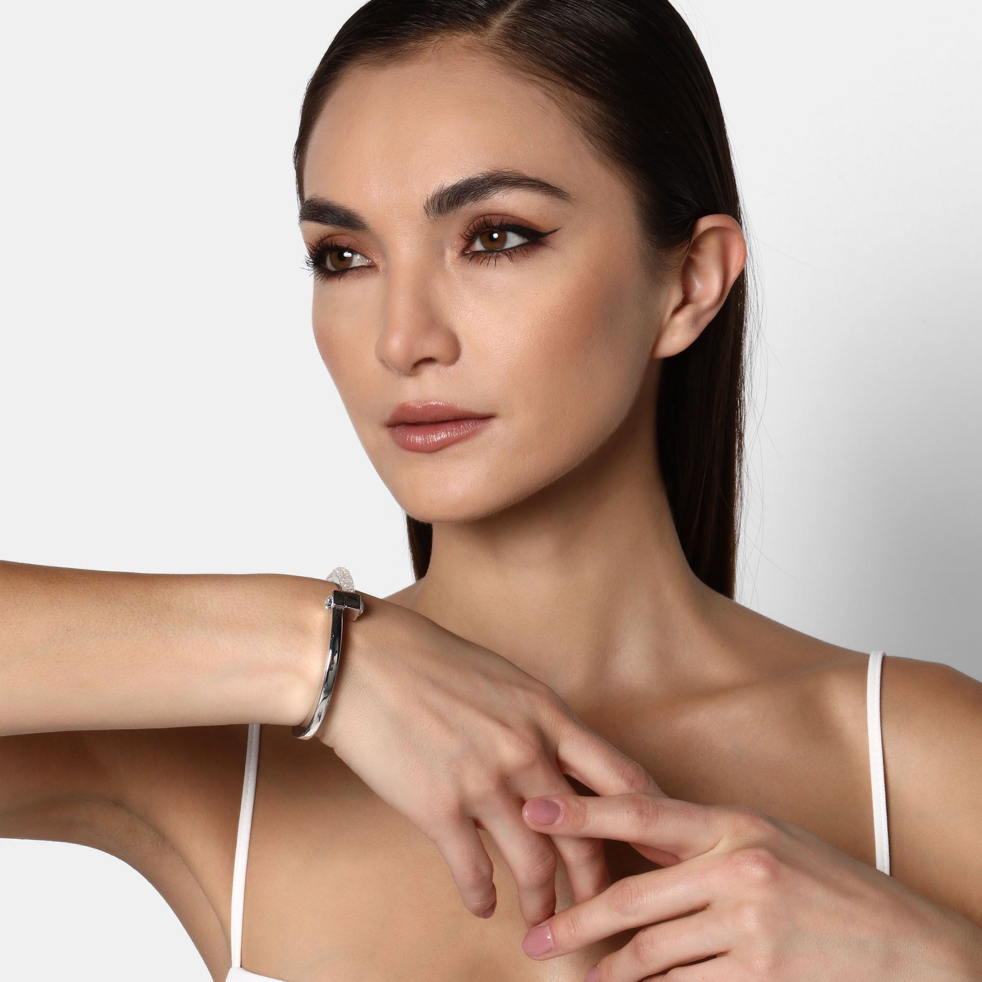Elegante brazalete, en baño de oro blanco de 18 quilates, original diseño, con cristal blanco corte brillante y banda de cristales blancos.
