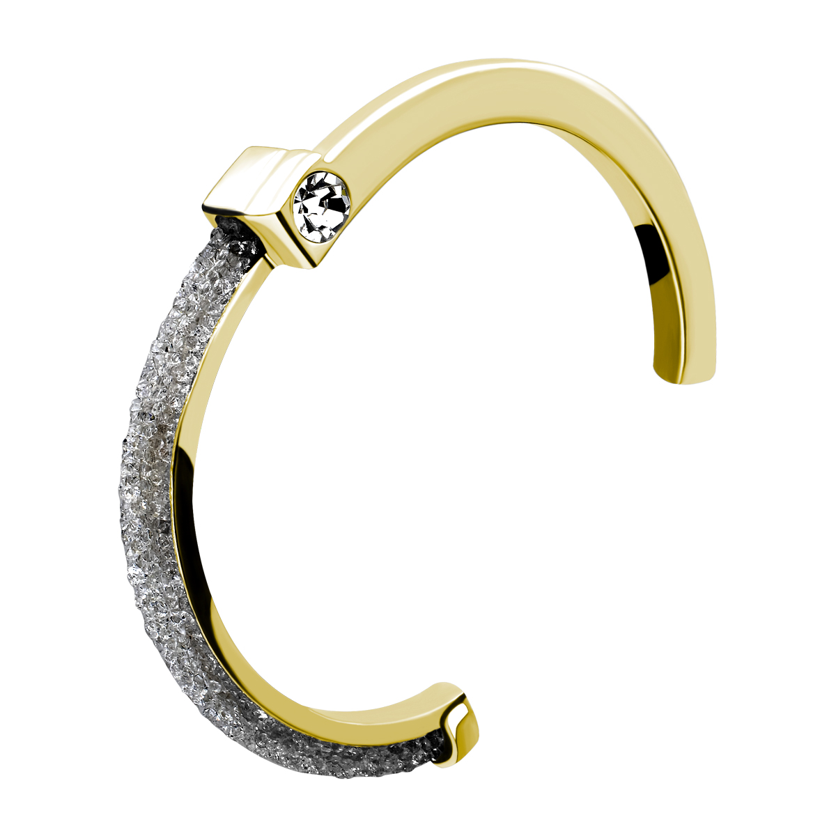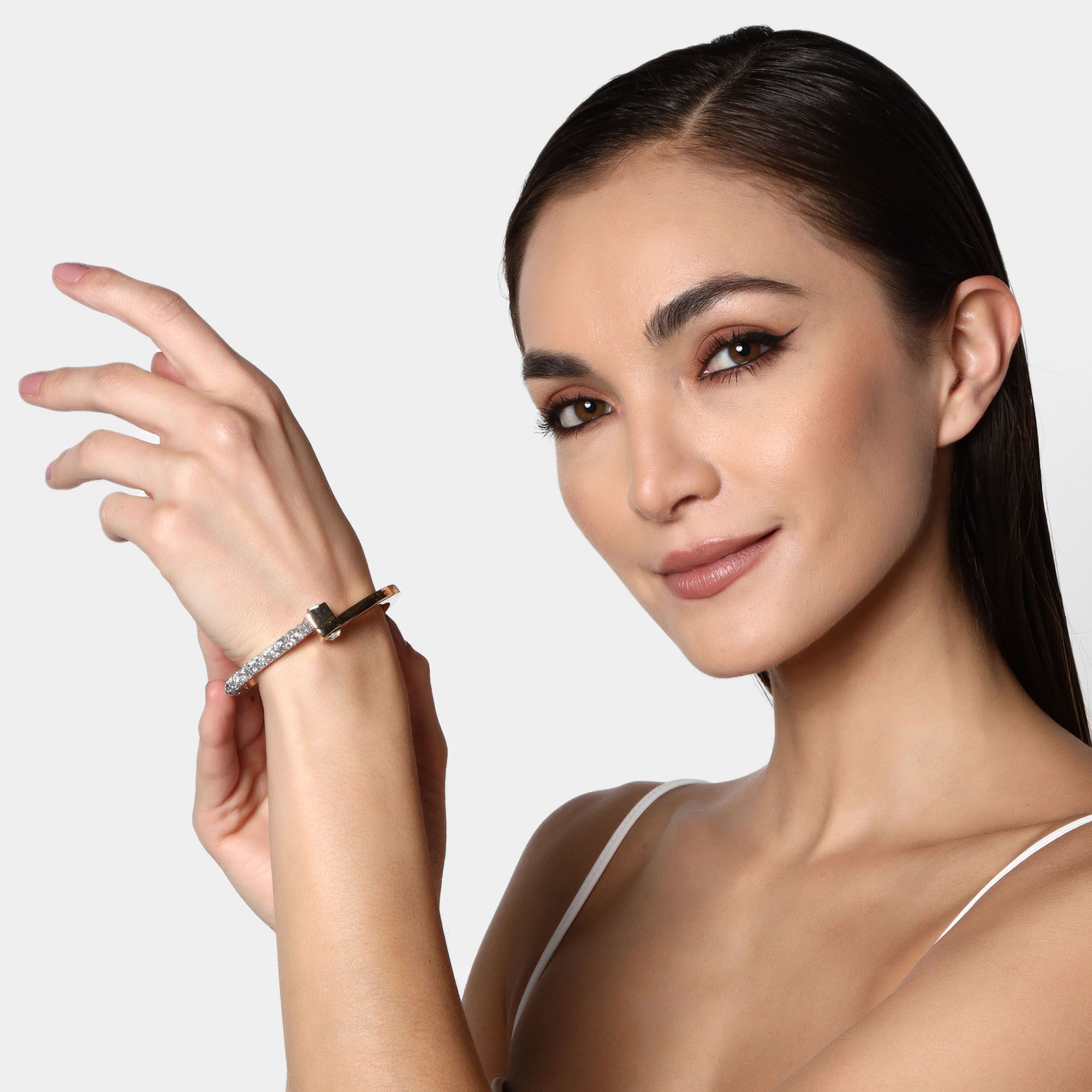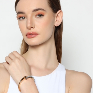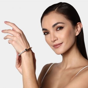Elegante brazalete, en baño de oro amarillo de 18 quilates, original diseño, con cristal blanco corte brillante y banda de cristales grises.
