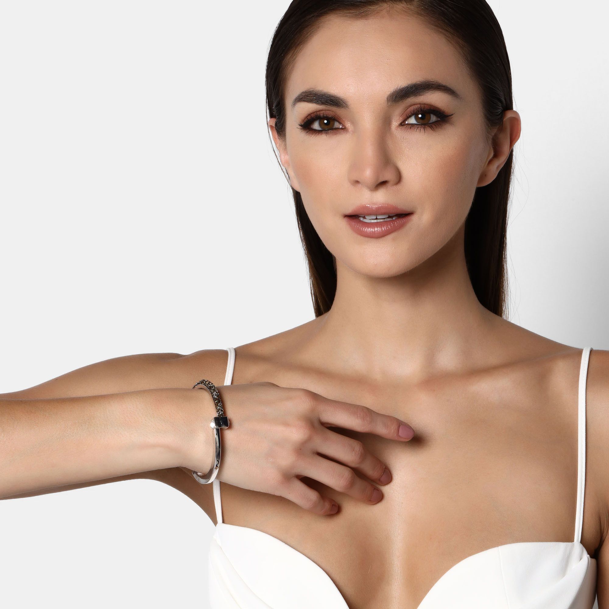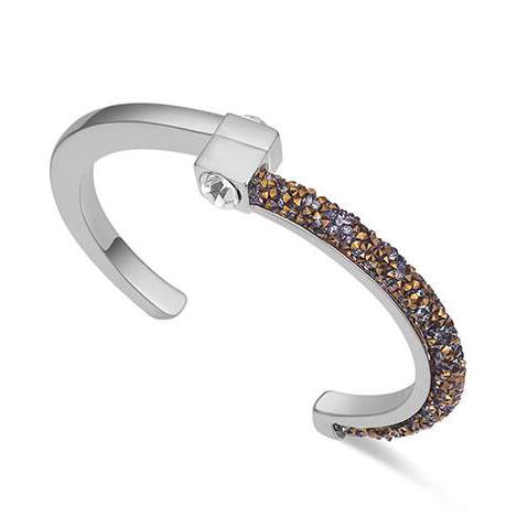 Elegante brazalete, en baño de oro blanco de 18 quilates, original diseño, con cristal blanco corte brillante y banda de cristales en colores dorado y blanco.