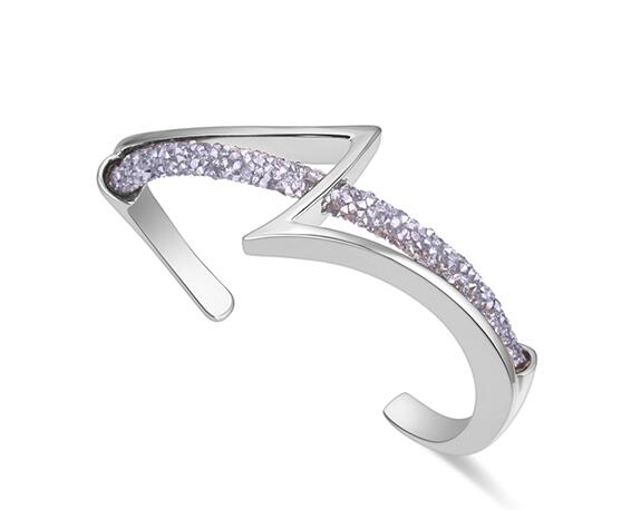 Hermoso brazalete, en baño de oro blanco de 18 quilates, con diseño de rayo e incrustraciones de cristales en color gris. Fabricado en una estructura de aleación de platino con rodio sin níquel.