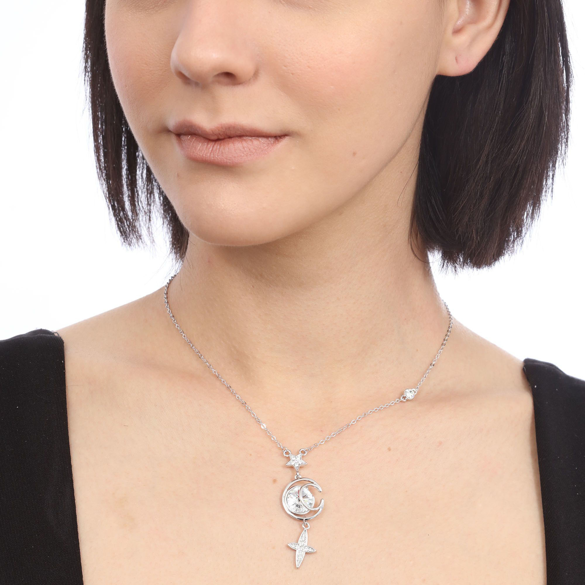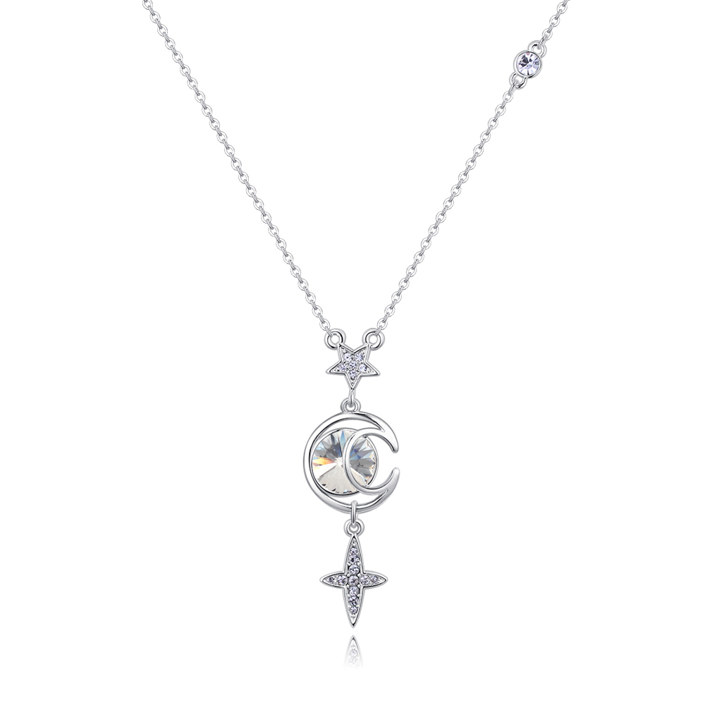 Collar en baño de oro blanco de 18 quilates, diseño de media luna y estrellas, con incrustaciones de cristales en color blanco.