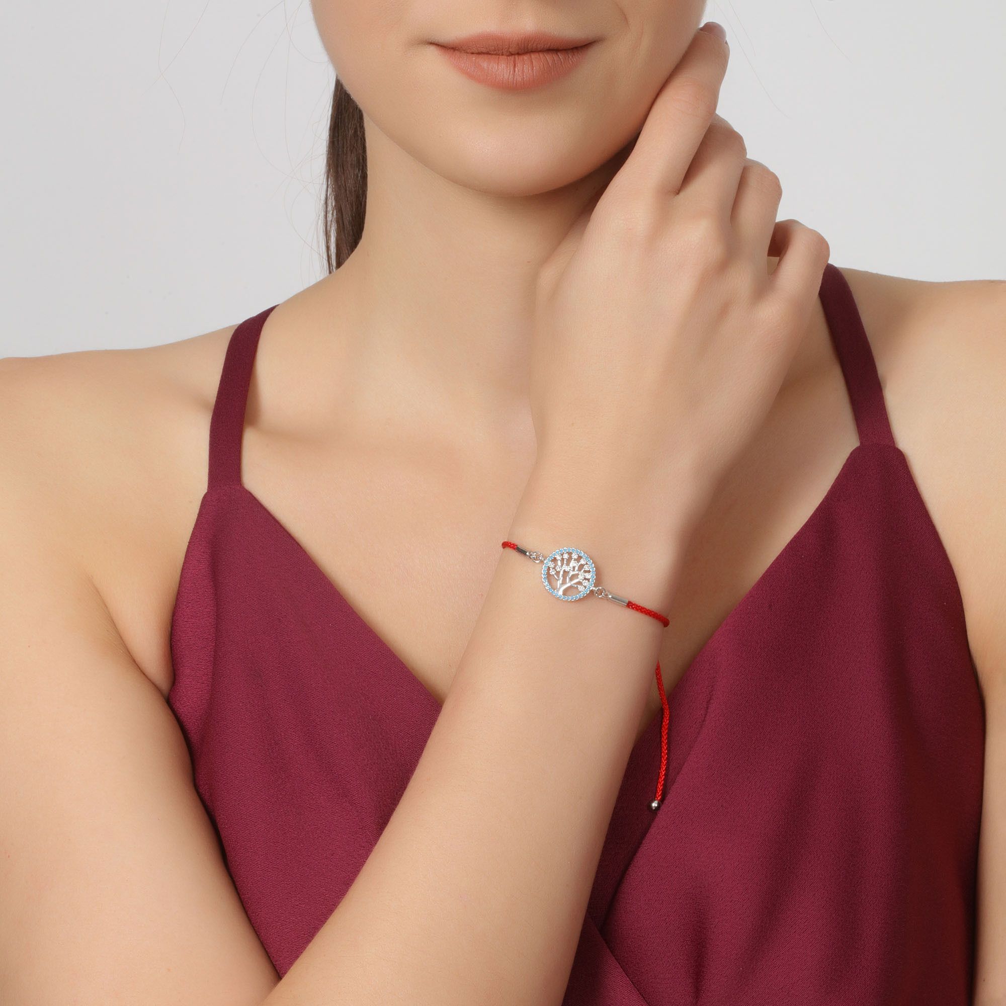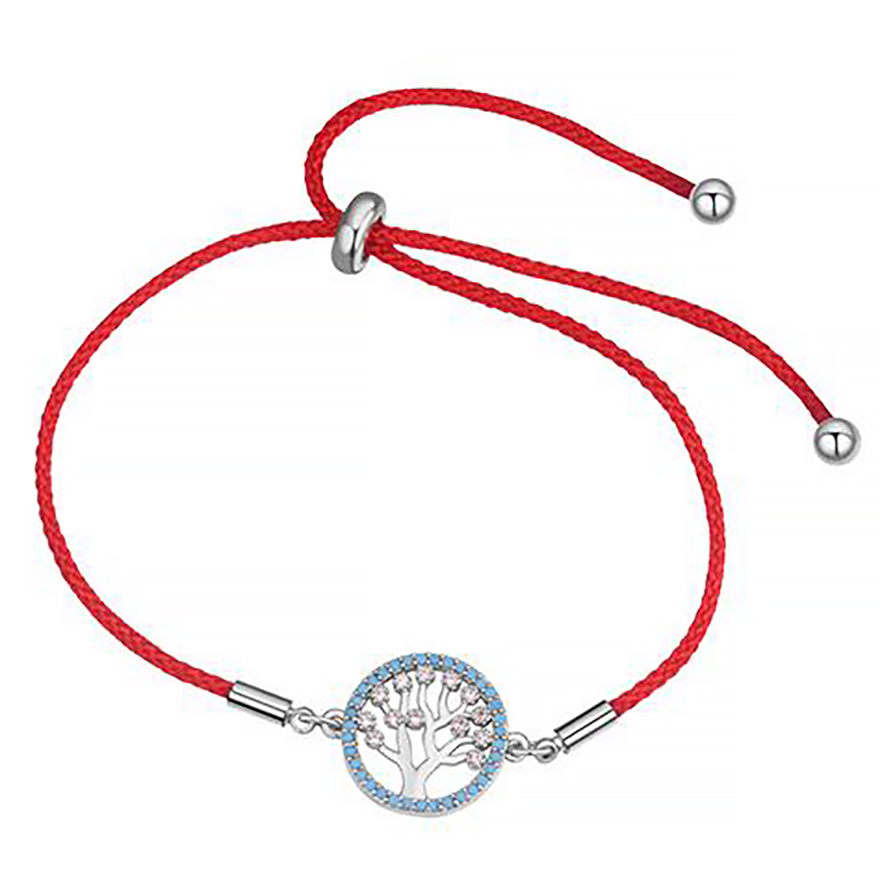 Hermosa pulsera, con detalles en baño de oro blanco de 18 quilates y correa de hilo reforzado color rojo, original diseño, con dije de árbol e incrustraciónes de cristal en color blanco y azul. Fabricado en una estructura de aleación de platino con rodio sin níquel.