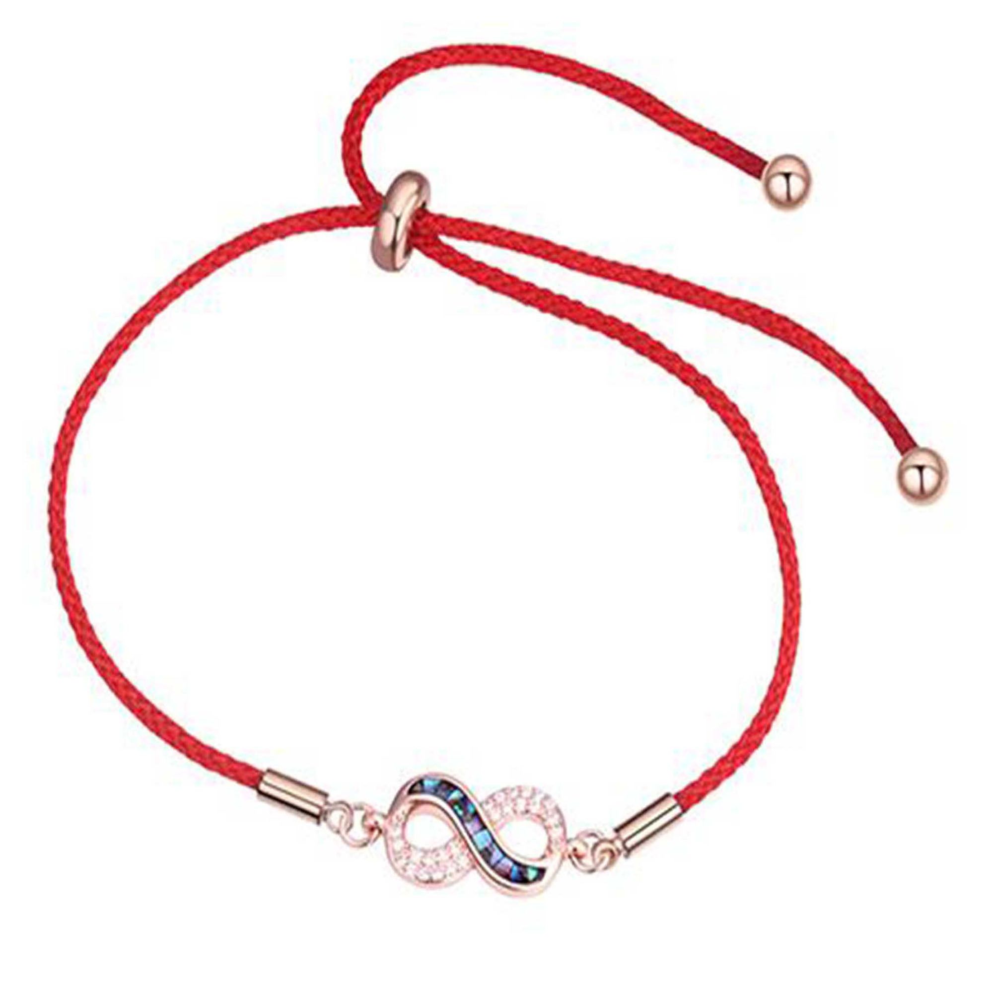 Linda pulsera, con detalles en baño de oro rosa de 18 quilates, correa de hilo reforzado color rojo, dije de infinito "∞", incrustación de madre perla multicolor y cristales blancos.