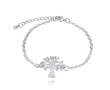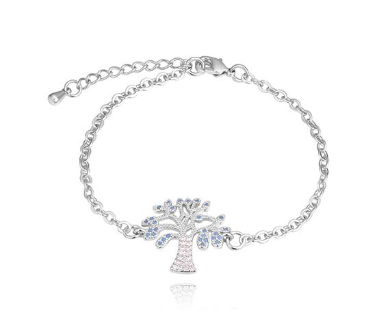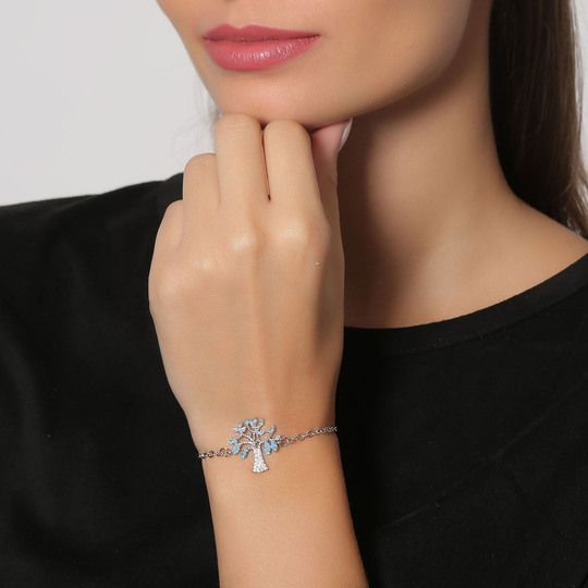 Hermosa pulsera, en baño de oro blanco de 18 quilates, diseño de árbol de la vida, con incrustaciones de cristales azules y blancos.
