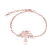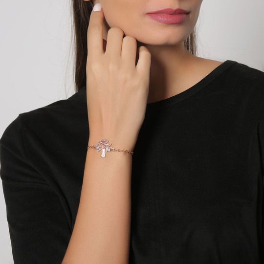 Hermosa pulsera, en baño de oro rosa de 18 quilates, diseño de árbol de la vida, con incrustaciones de cristales azules y blancos.