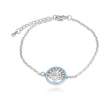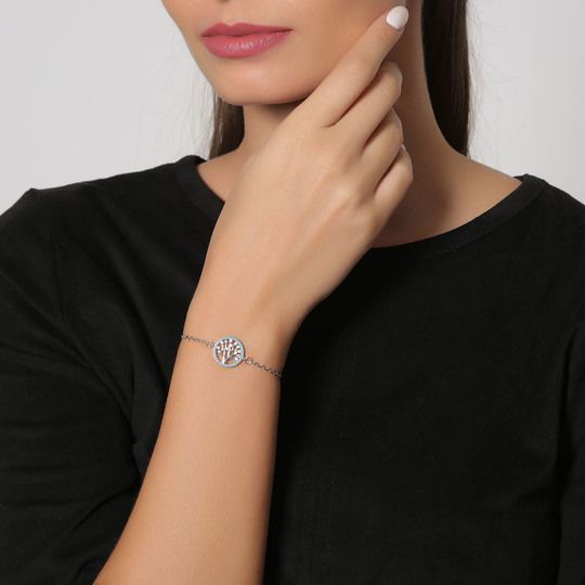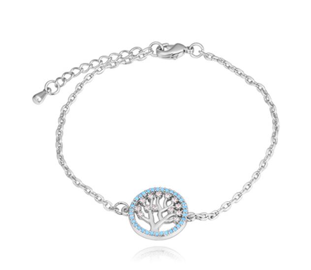Hermosa pulsera, en baño de oro blanco de 18 quilates, diseño de árbol de la vida, con incrustaciones de cristales azules y blancos.