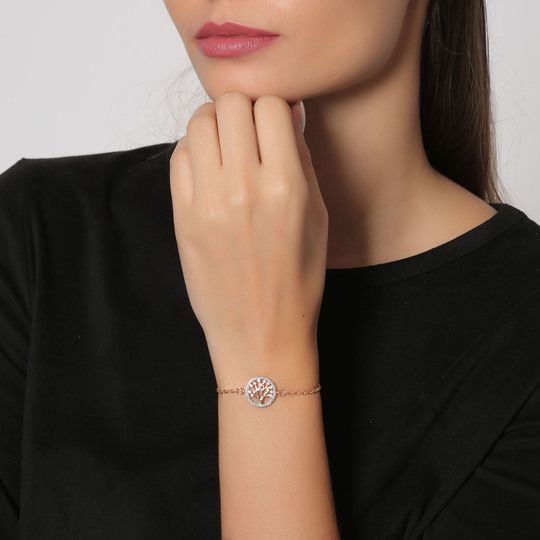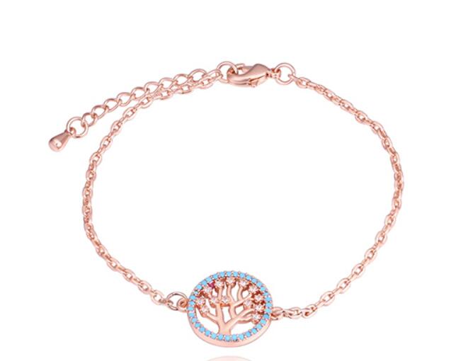 Hermosa pulsera, en baño de oro rosa de 18 quilates, diseño de árbol de la vida, con incrustaciones de cristales azules y blancos.