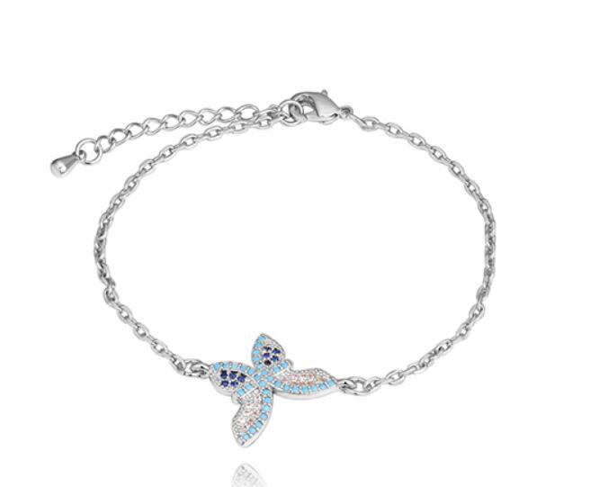 Linda pulsera en baño de oro blanco de 18 quilates, diseño de mariposa, con incrustaciones de cristales en tonos azules y blanco. Fabricado en una estructura de aleación de platino con rodio sin níquel.
