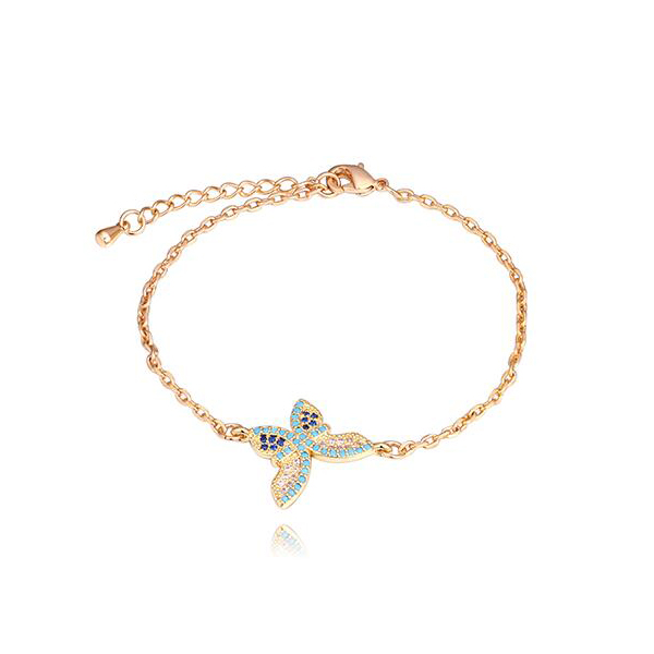Linda pulsera, en baño de oro amarillo de 18 quilates, diseño de mariposa, con incrustaciones de cristales en tonos azules y blanco.