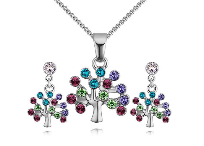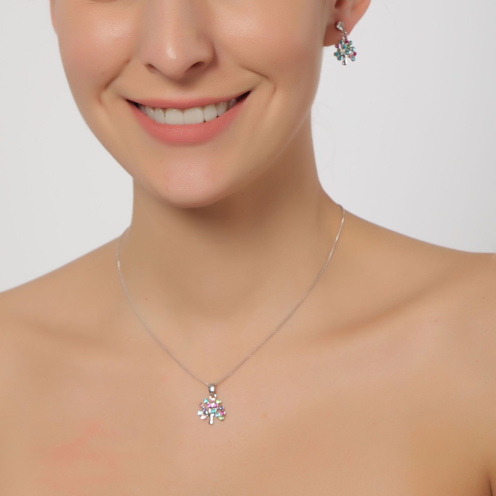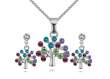 Juego de aretes y dije con cadena en baño de oro blanco de 18 quilates, diseño de pequeños arboles con incrustración de cristales en colores.