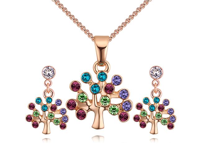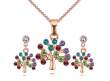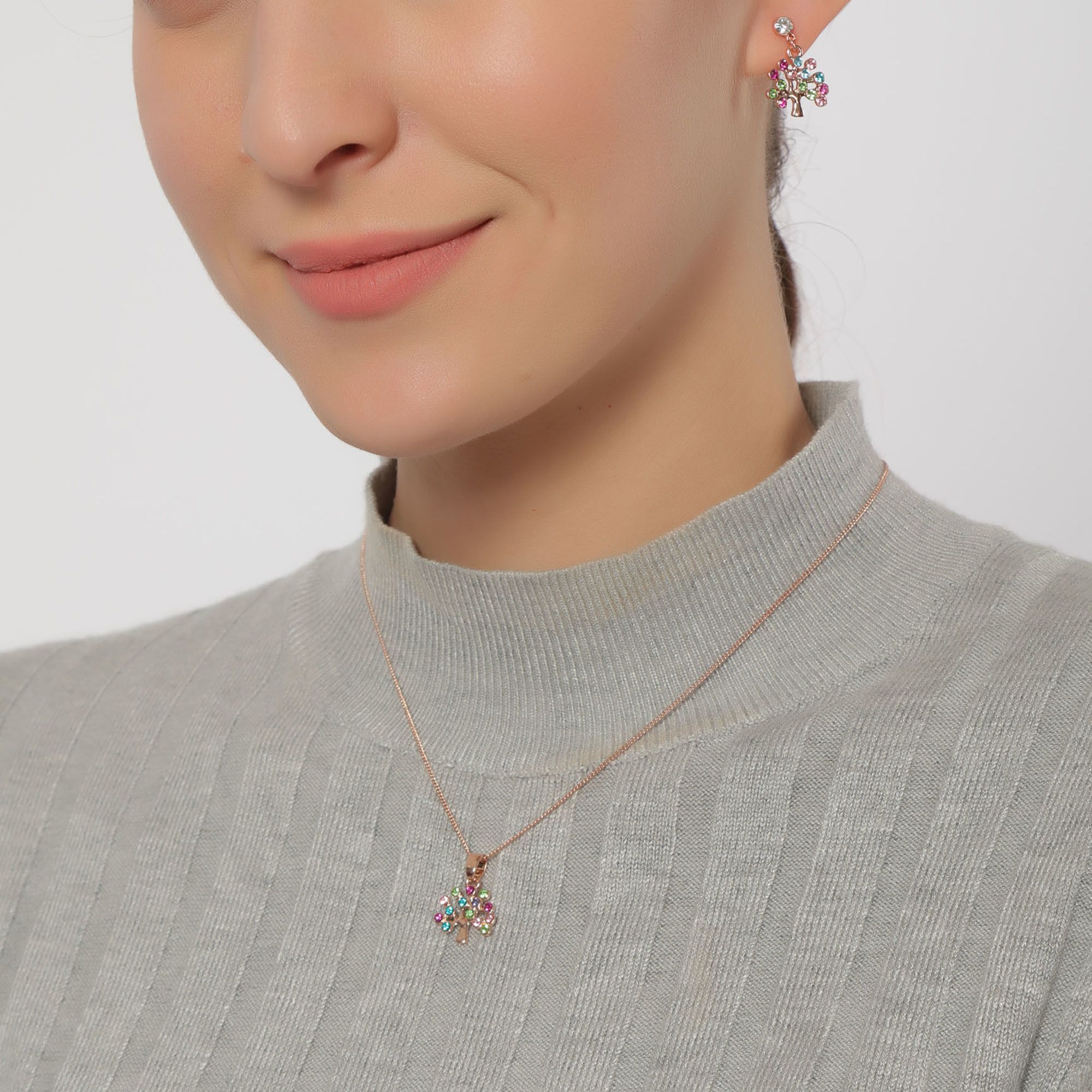Juego de aretes y dije con cadena en baño de oro rosa de 18 quilates, diseño de pequeños arboles con incrustración de cristales en colores.