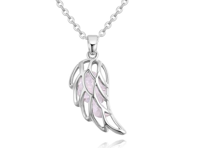 Dije con cadena en baño de oro blanco de 18 quilates, diseño de ala de ángel con cristales blancos en el interior.