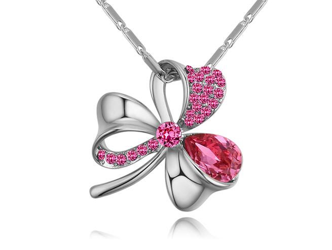Dije con cadena en baño de oro blanco de 18 quilates, diseño de trébol, con cristal rosa corte pera e incrustaciones de cristales en color rosa.
